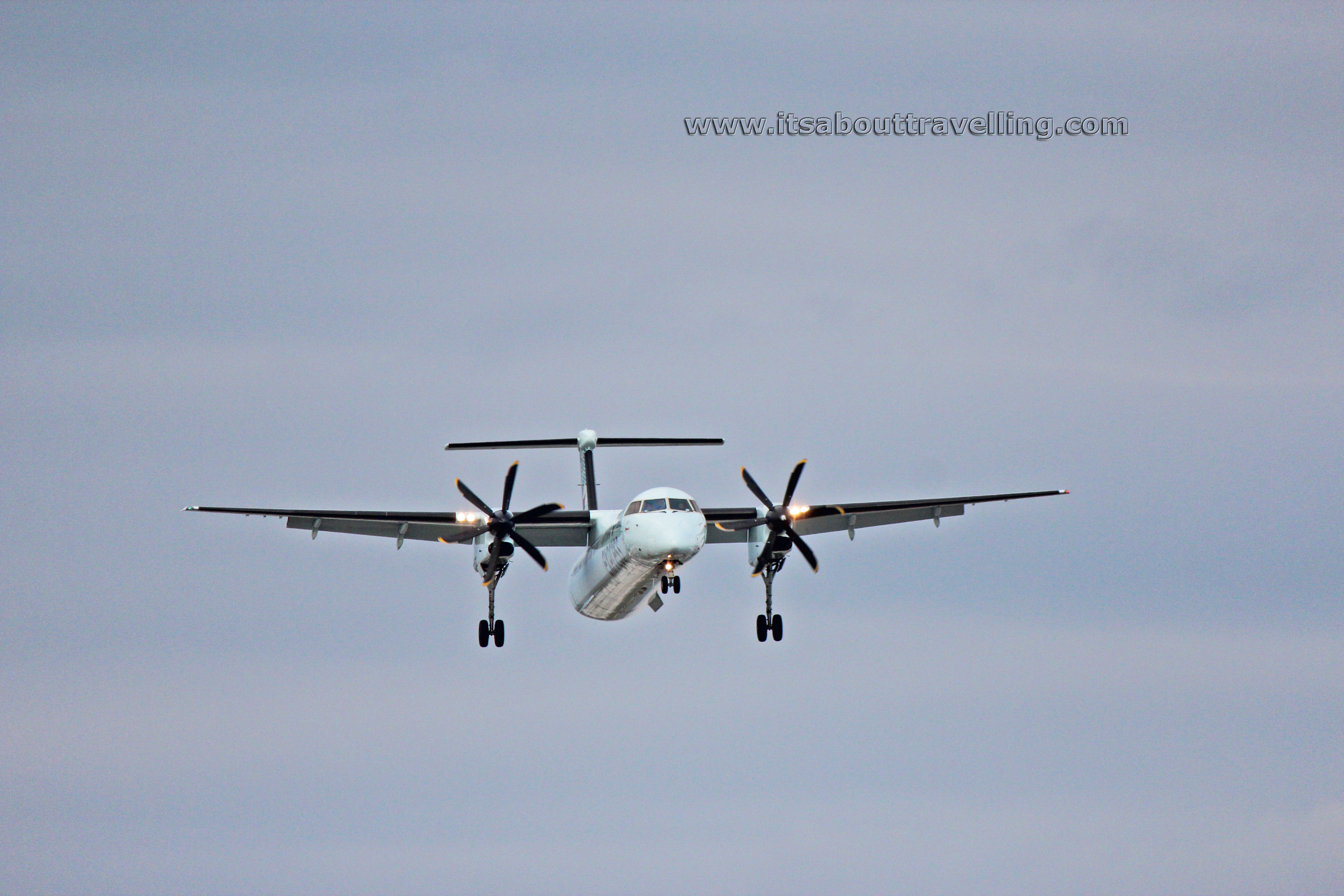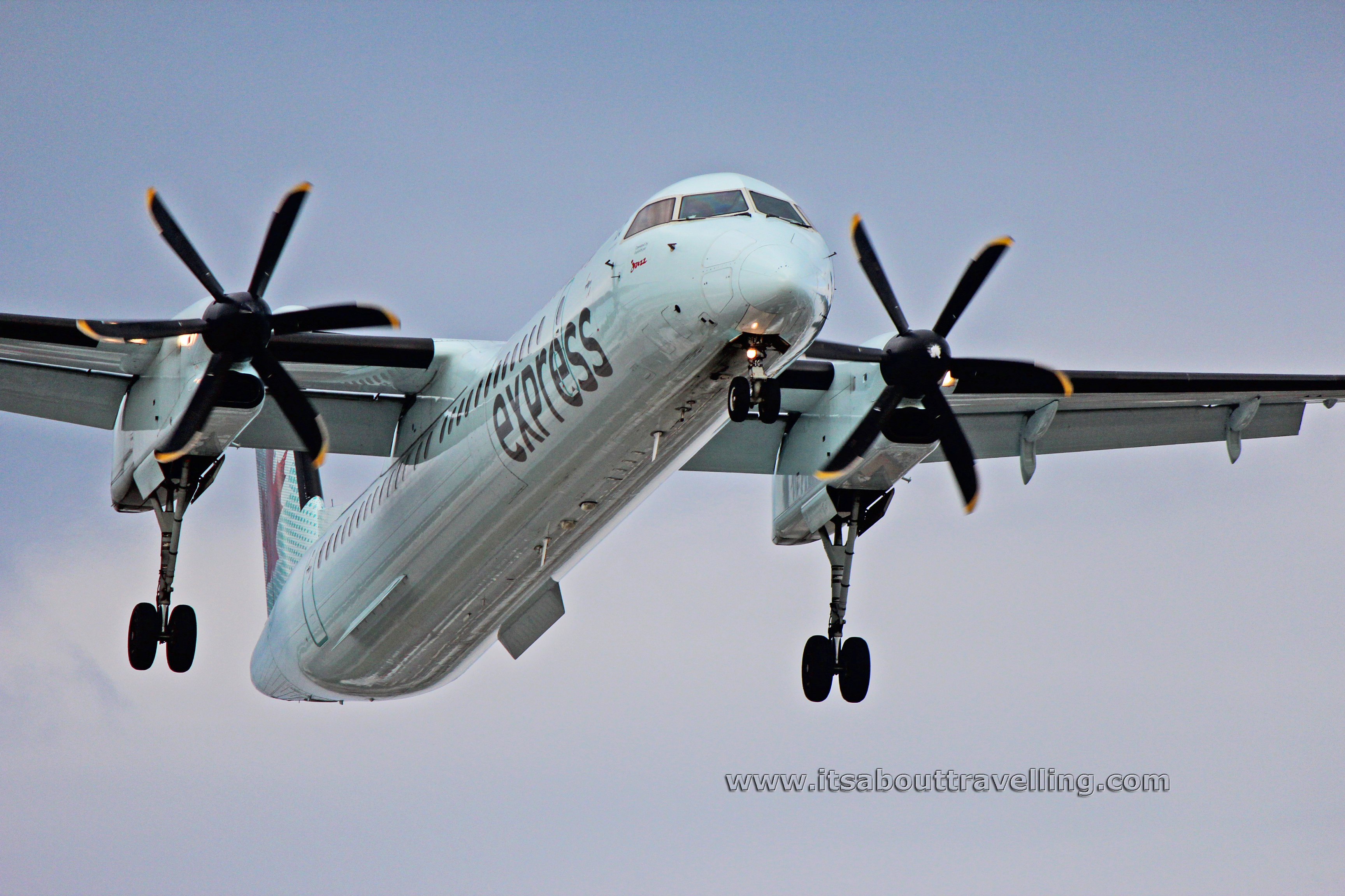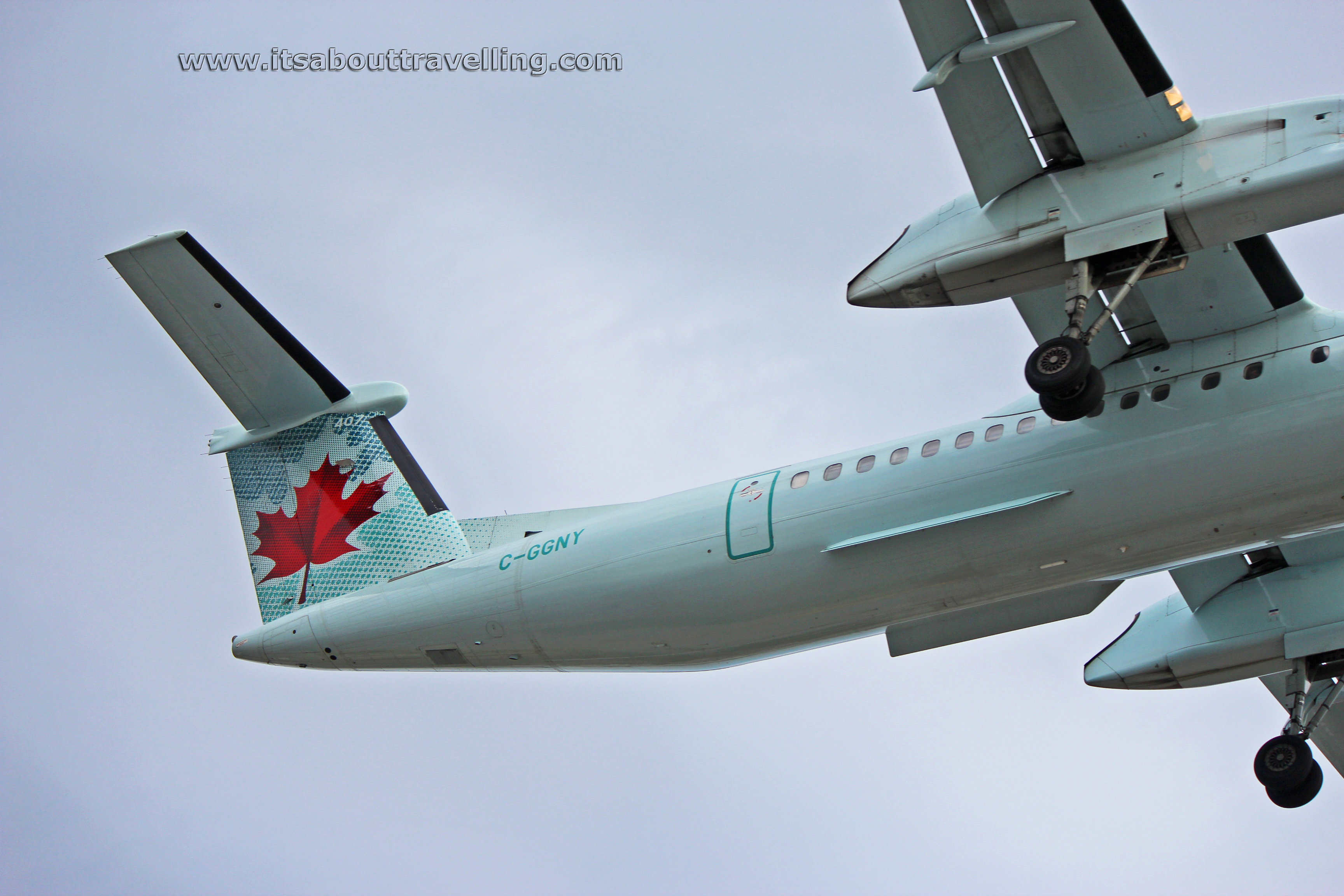 The images below were taken in September, 2014. This Bombardier Dash 8 Q400 belongs to Air Canada Express and is about to land at Toronto Pearson International Airport (YYZ). The registration number on the airliner is C-GGNY.