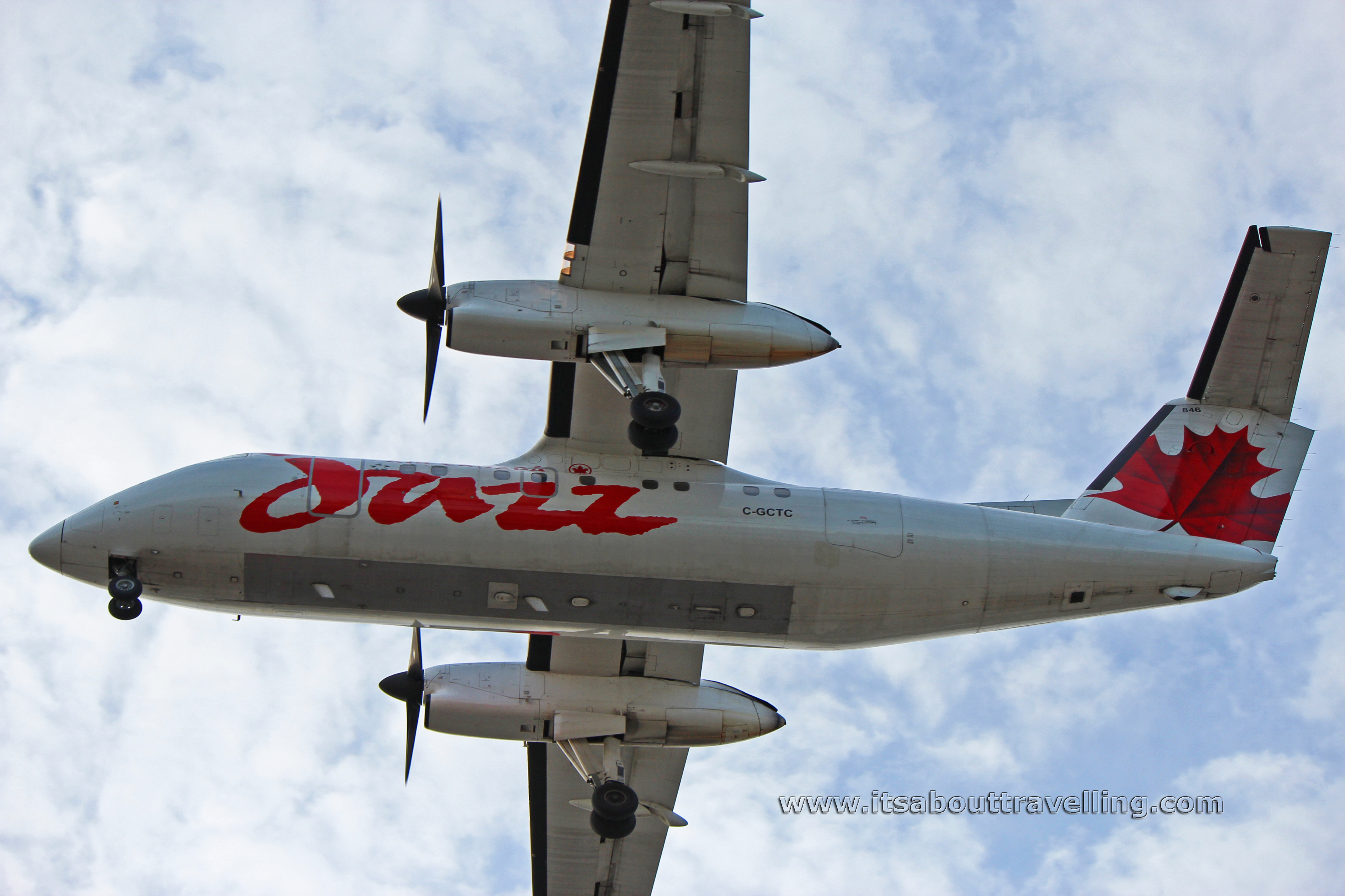 The images below were taken in May, 2012. This Bombardier Dash-8 belongs to Air Canada Jazz and is about to land at Toronto Pearson International Airport (YYZ). The registration number on the airliner is C-GCTC.
