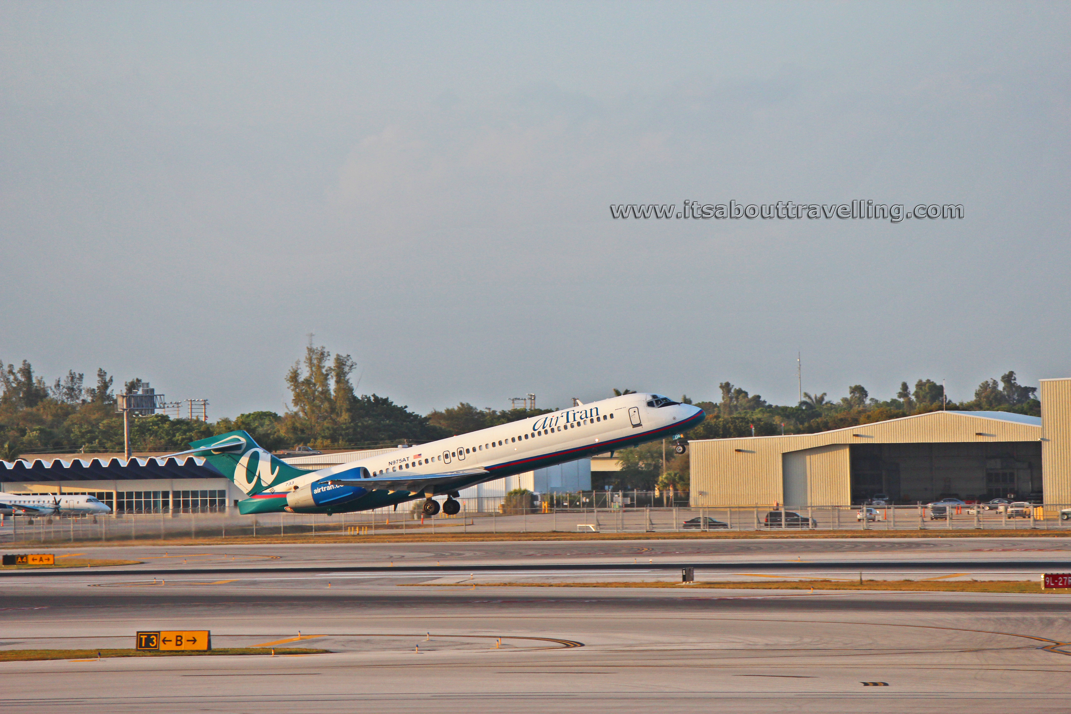 The images below were taken in February, 2013. At the time, this Boeing 717-200 belonged to Air Tran and was taking off from Ft. Lauderdale-Hollywood International Airport (FLL) in Florida. It now belongs to Delta Airlines. The registration number on the airliner is N975AT.