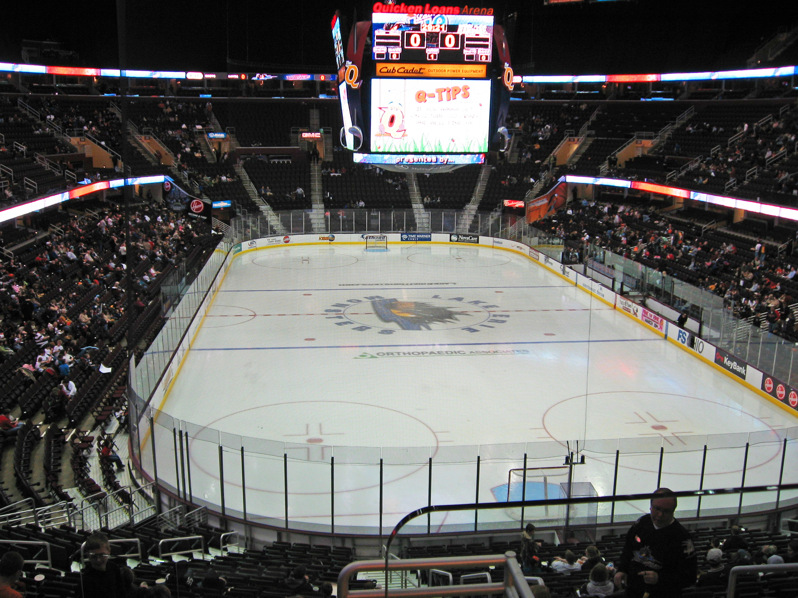Inside Quicken Loans Arena for a Lake Erie Monsters home game. The arena is better known as the home of the Cleveland Cavaliers of the National Basketball Association (NBA). The Q was opened in 1994 and can house over 20,000 spectators for hockey or basketball.