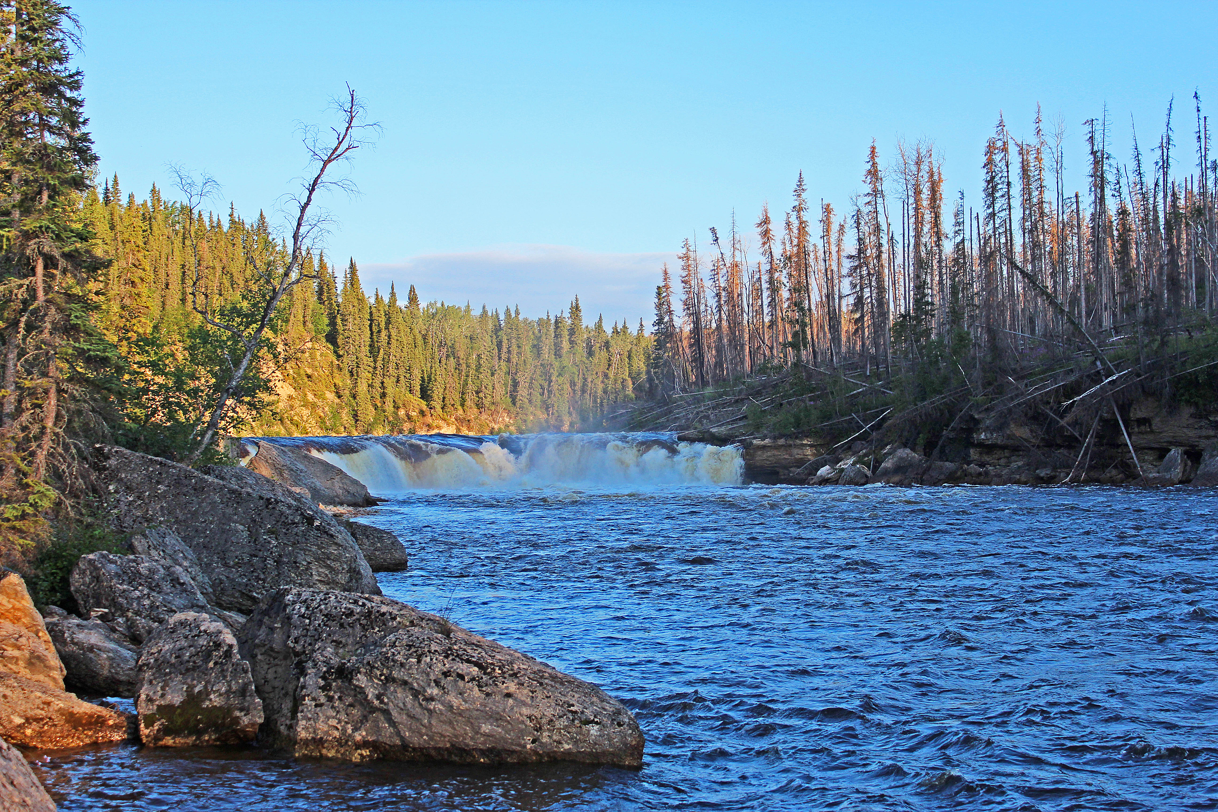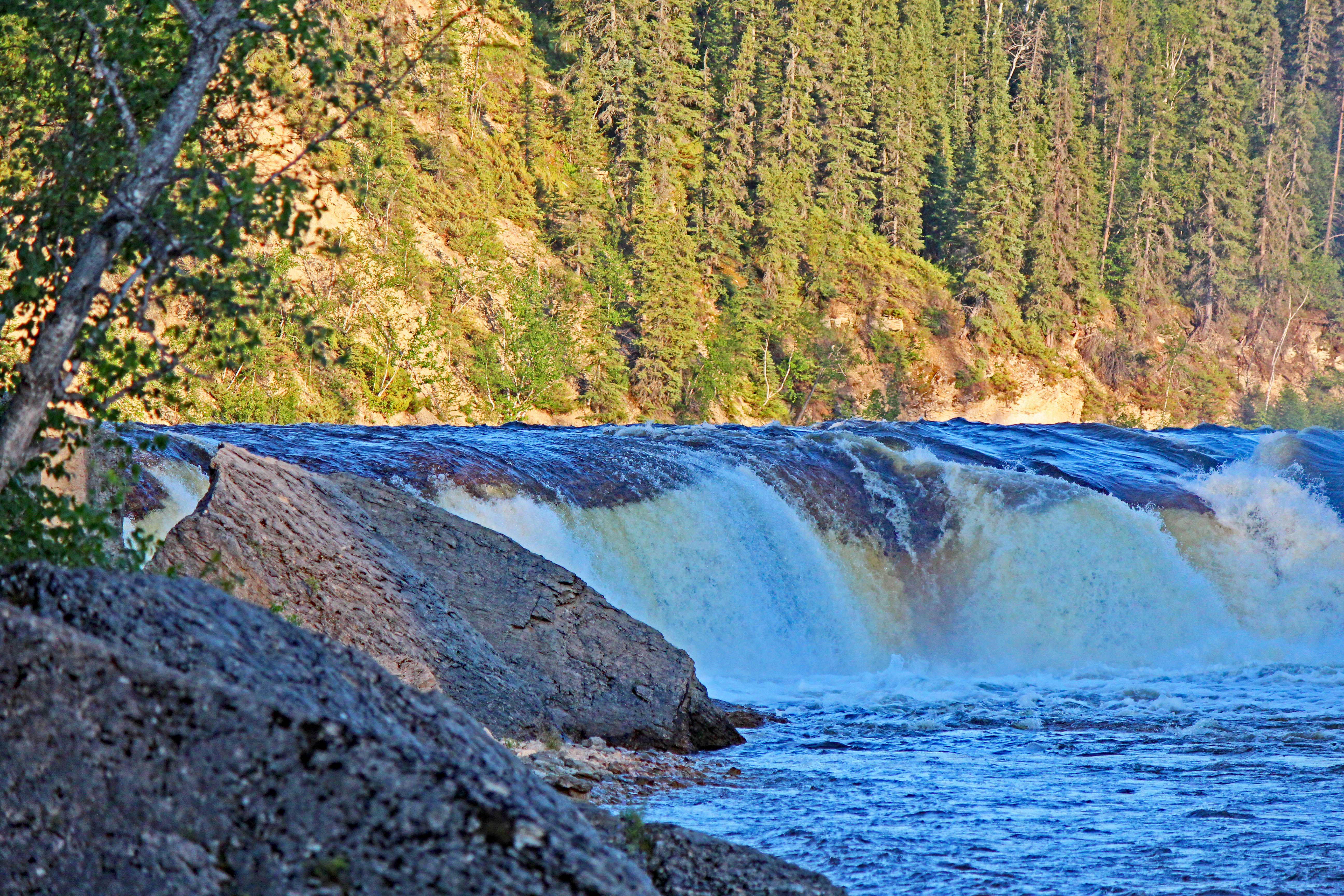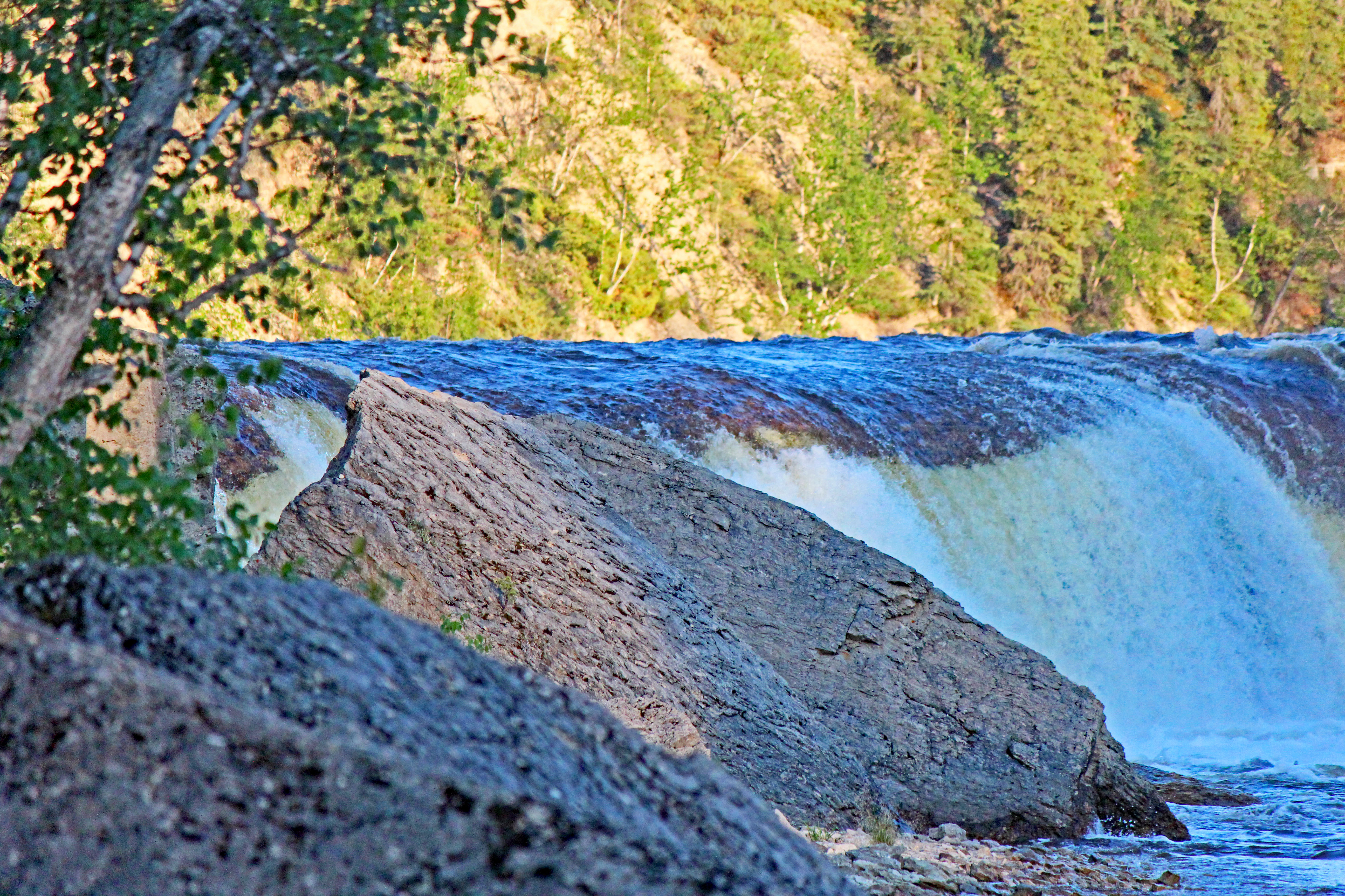 When we visited, the water anywhere in the southwest portion of the Northwest Territories were high due to massive rainfalls in northern British Columbia and Alberta. If the water was a bit lower, the base of Coral Falls could probably be accessed at river level. As it was, I was able to get quite close and probably could have made it all the way with a bit of trekking through the water.
