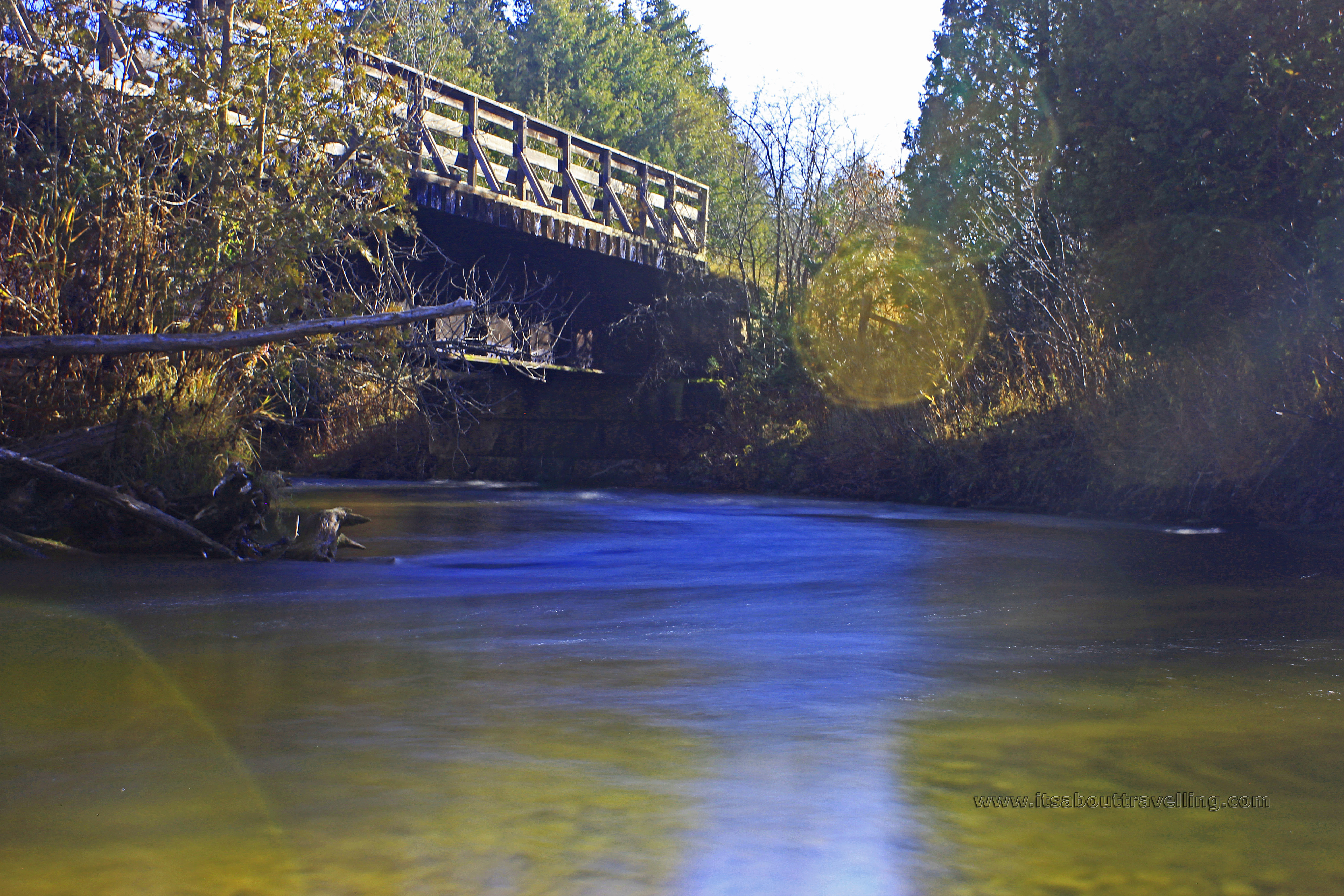At this spot, the bridge over the Credit River is an old rail trestle. The water is fast all year round as it does a pretty sharp ‘S’ curve as it passes beneath the bridge.