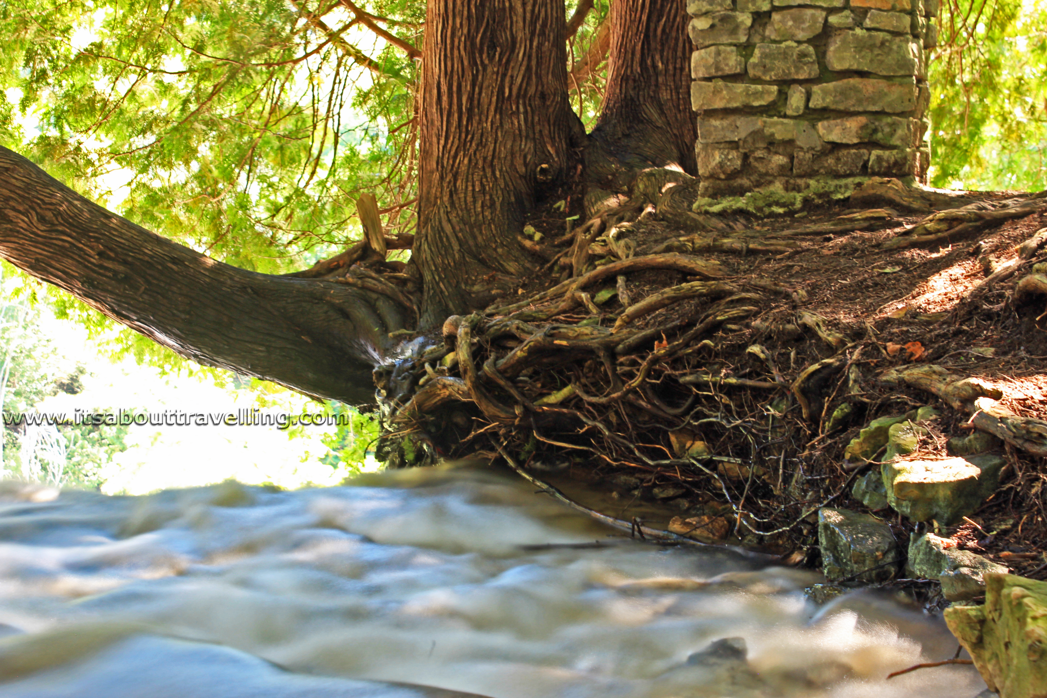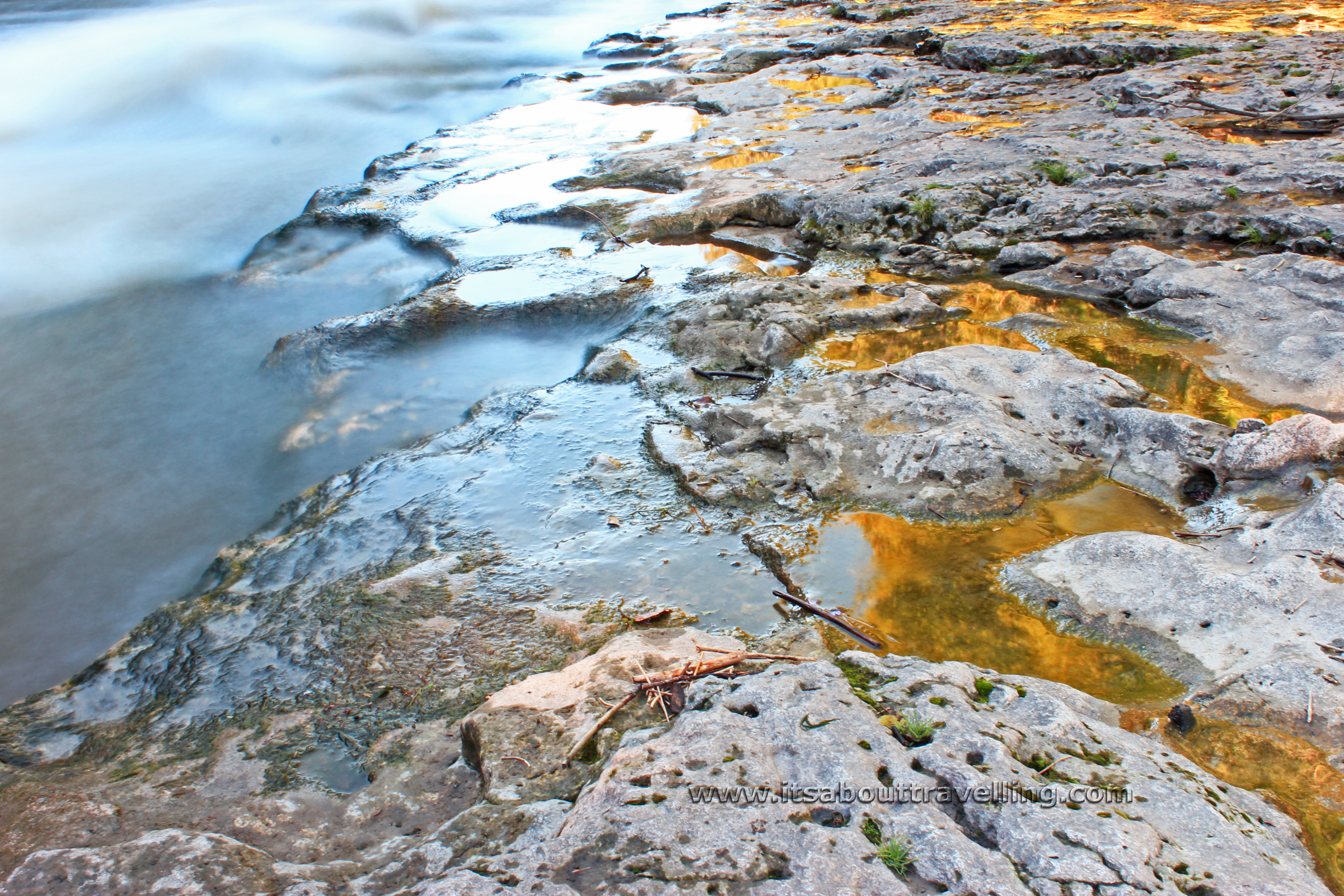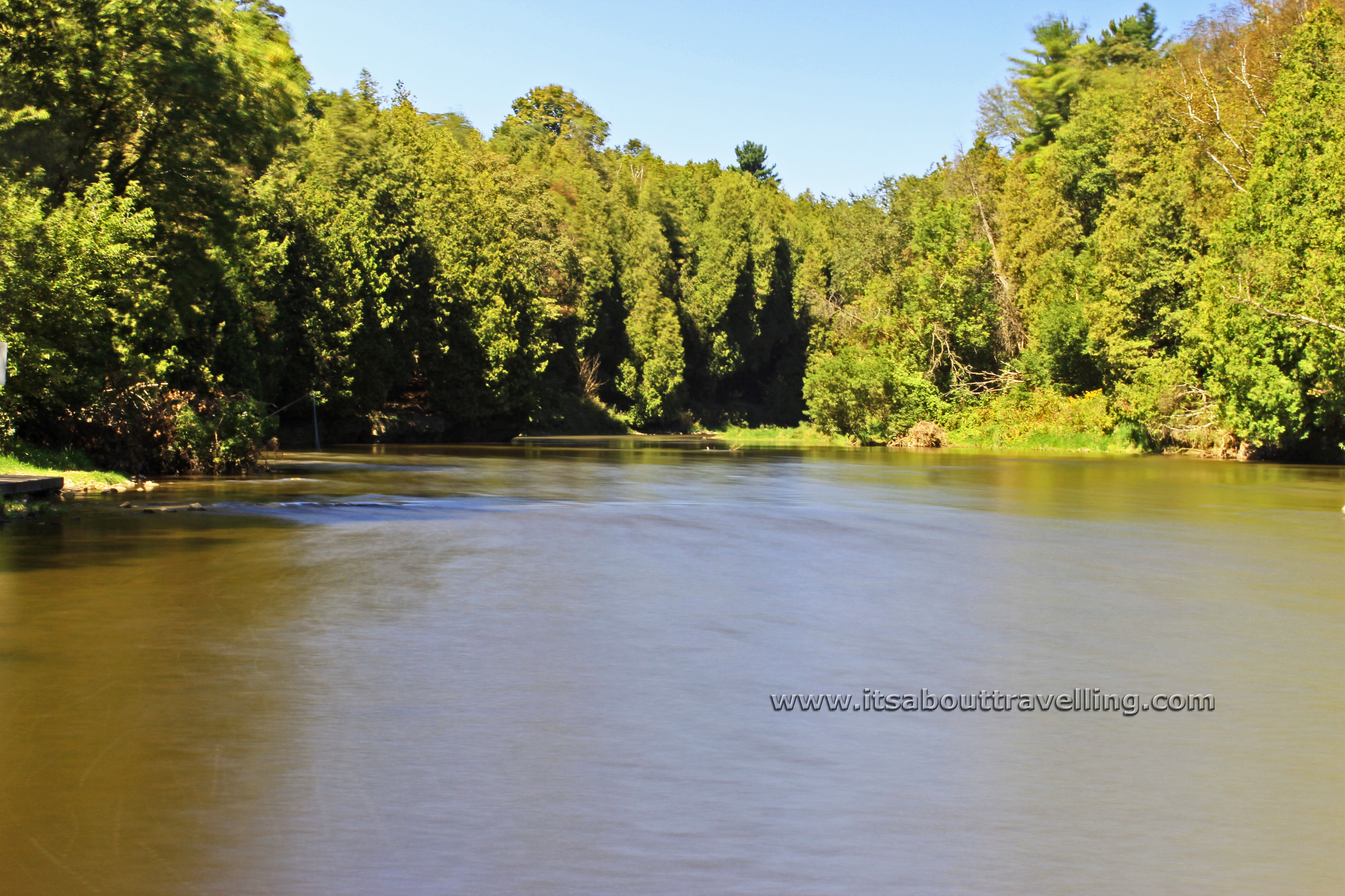 I love the above image. The puddles and pools with the reflection of the sun lit trees above the gorge just look so cool beside the blur of the main channel of the Grand River.