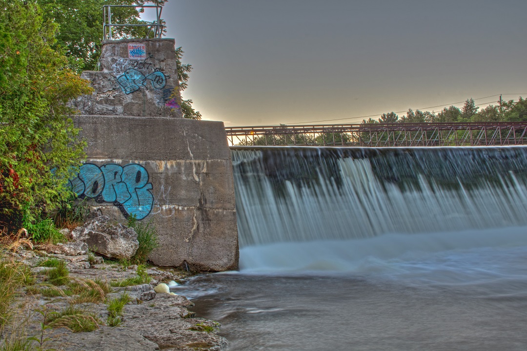 In the gallery, the first four images were taken at the Bissell Dam. This curved concrete structure is located upstream from the downtown on the Grand River. the dam is named for T.E. Bissell, an early business leader in Elora. Subtle ‘ruins’ remain around the dam from days gone by. The dam can be reached via boardwalk in Bissell Park and there is a walking bridge just upstream to take pedestrians across the Grand River.