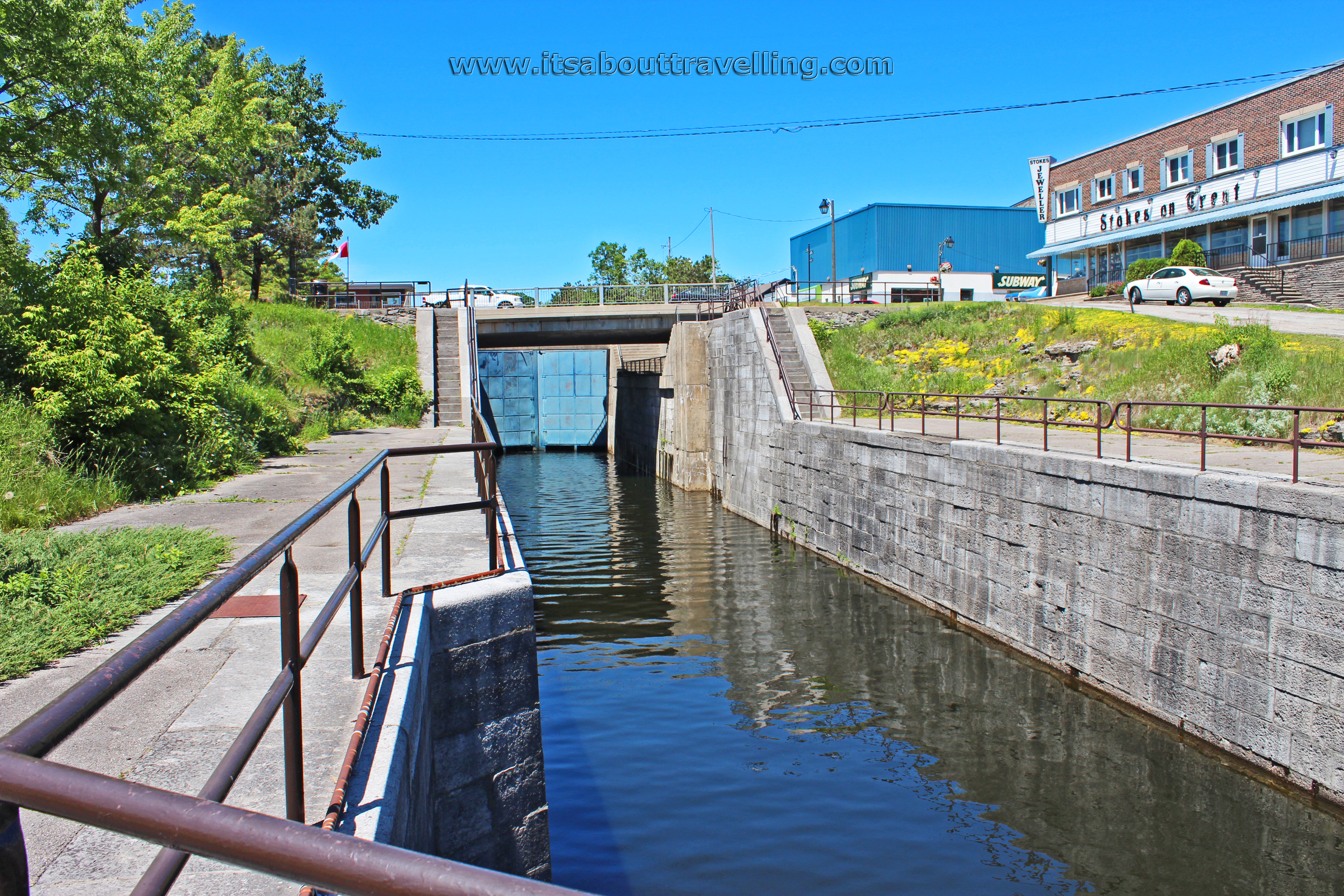 Above is a view up the canal to the big blue doors. The land to the left is the island with the waterfall on the other side. The land to the right is the old business section of Fenelon Falls. On the right of the canal, the walkway can be seen going up stairs to street level before dropping back down again to go under the bridge.