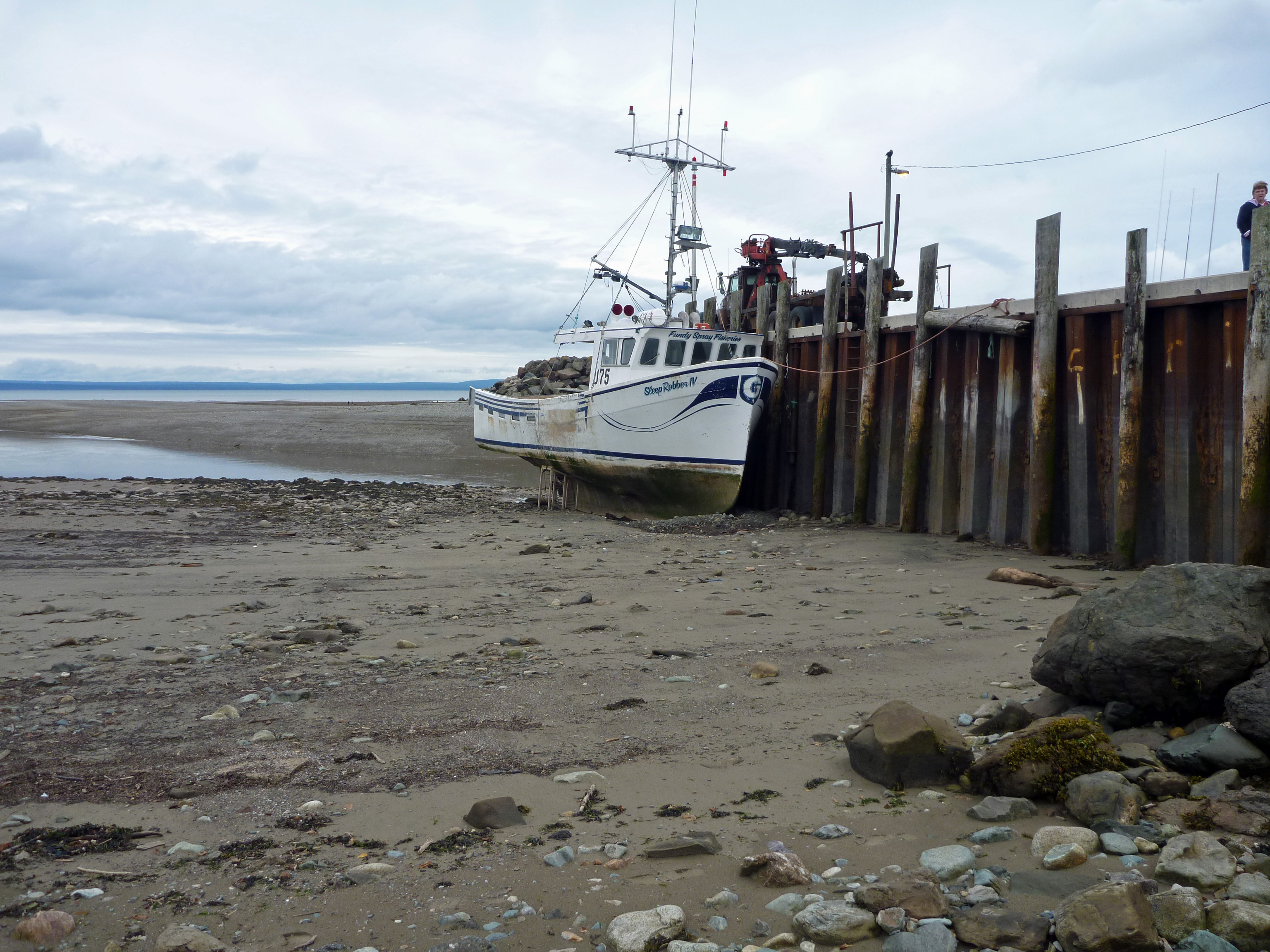 Unlike the scenes from the dried up Aral Sea, the water will come back in just a matter of hours to allow this boat to float out to sea if it wishes. Directly behind the boat is the Upper Salmon River flowing to the distant Bay of Fundy. The dock is in the town of Alma.