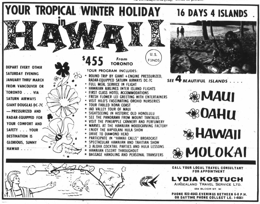This advertisement ran in the September 1, 1965 issue of the Mississauga News. The $455 was in U.S. dollars and included round trip airfare and all the many other features shown above.