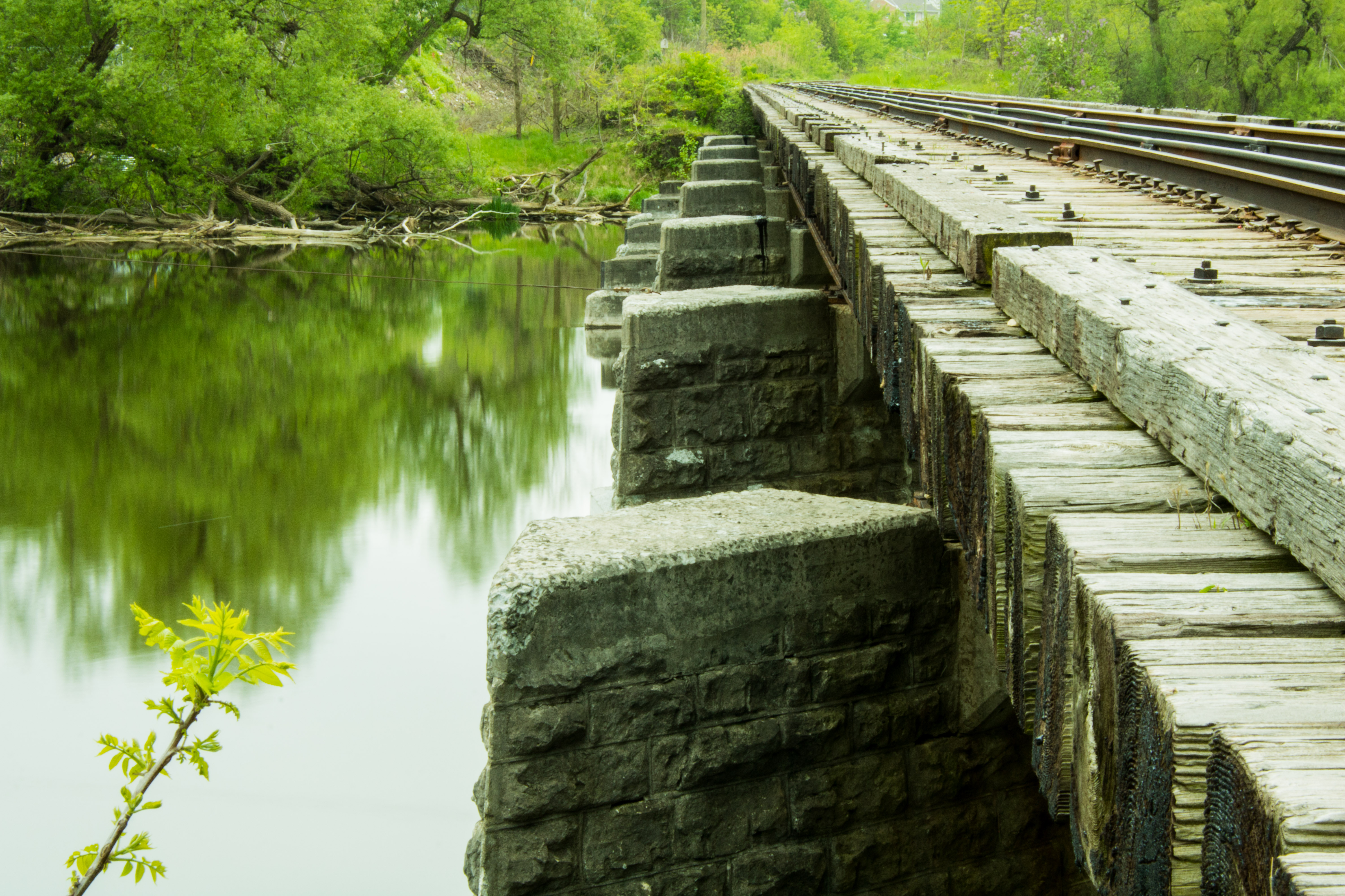 Shown in the images above are the train tracks that cross the Speed River, not far downstream from the dam. The dam shown is the Silknit Dam, which creates the Hespeler Millpond upstream. Some of the images are taken from Jacob’s Landing.