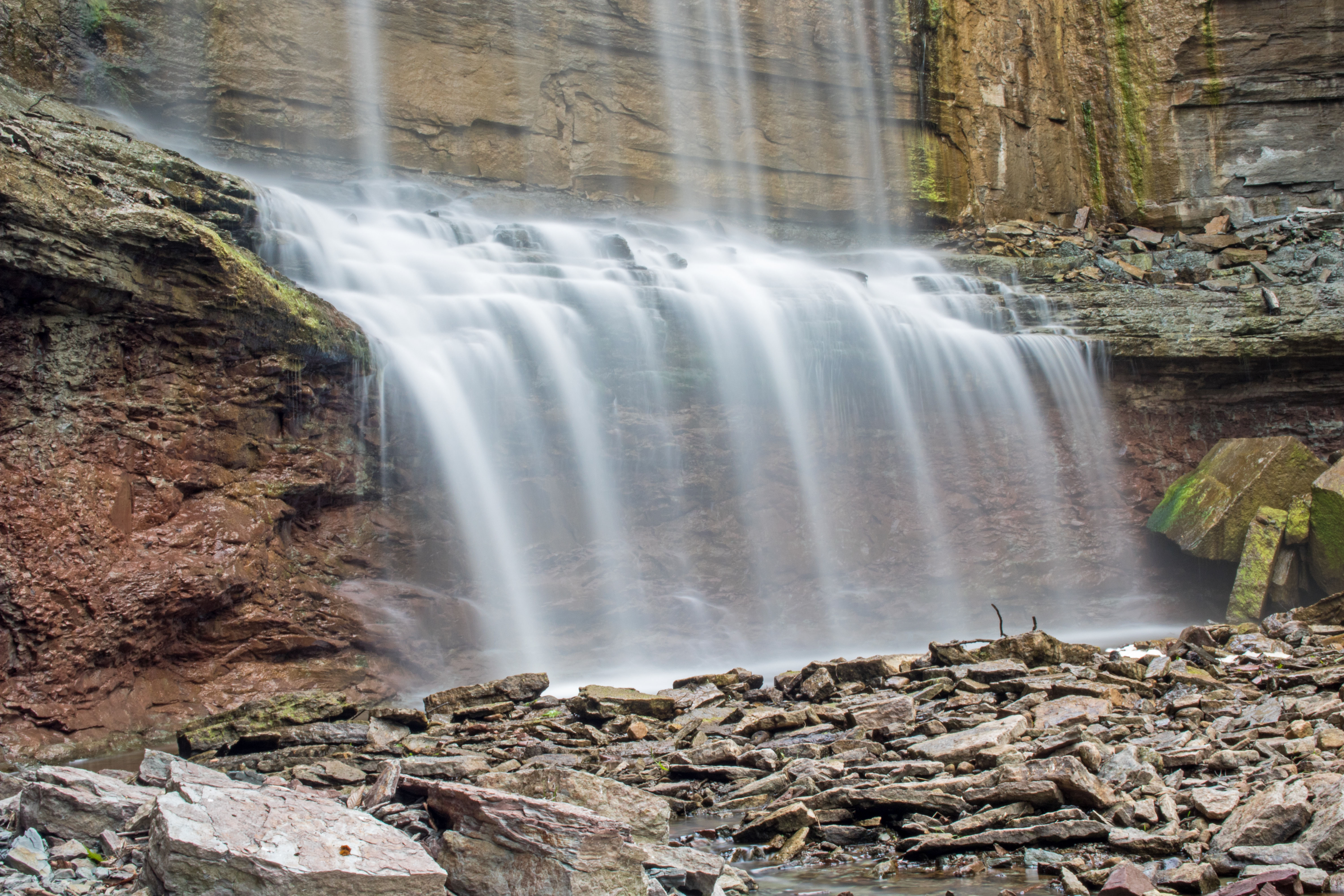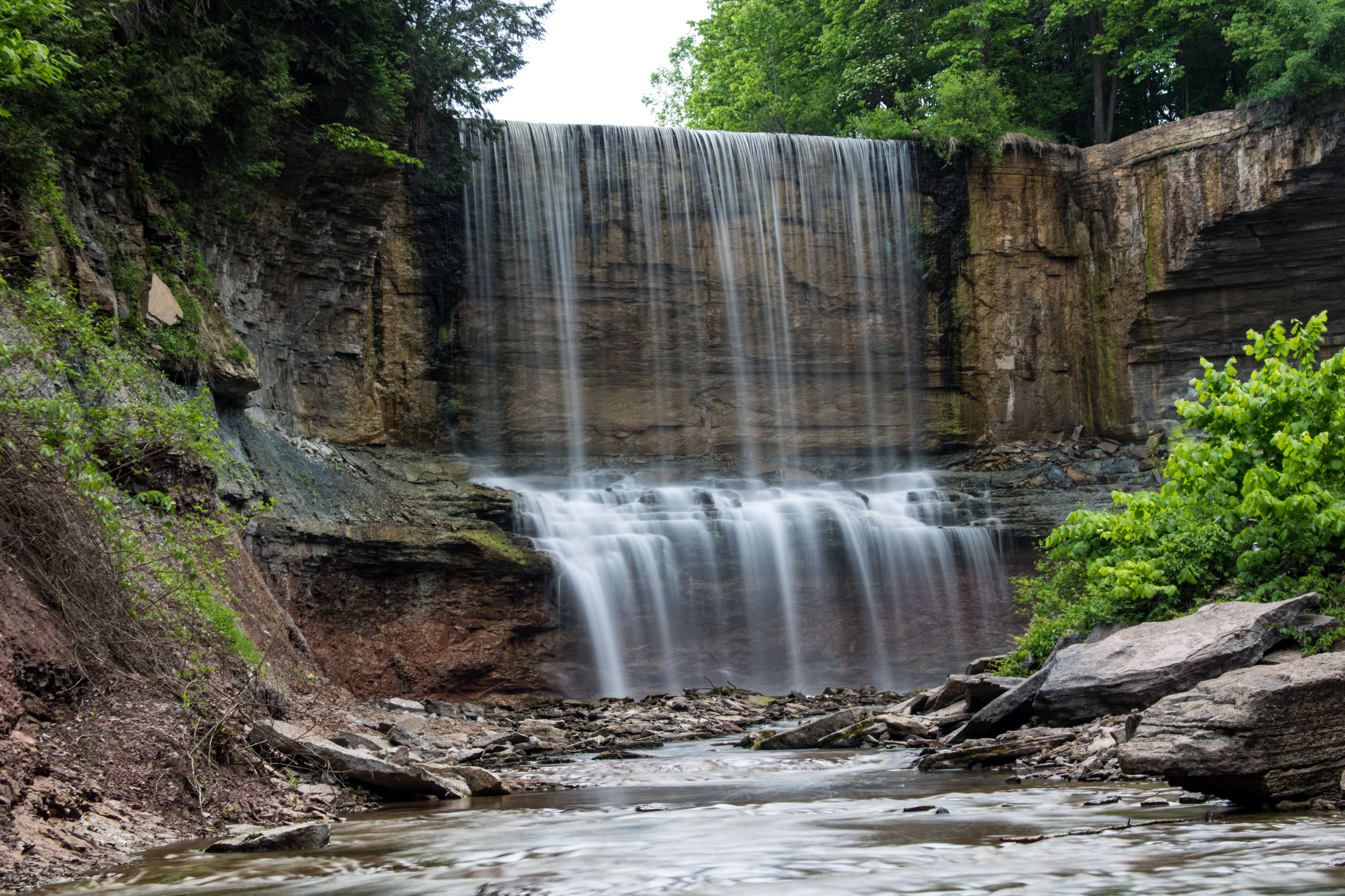 I was staring at Indian Falls, near Owen Sound, Ontario, and I was confused. The last time I visited was in 2012 (see here for what the waterfall used to look like) and the picturesque waterfall was a straight curtain of water from crest to base. Now, the curtain hits a ridge about two thirds down. Before, you could actually walk behind the curtain. Now, the water hugs the side of the cliff with very little overhang. And, there was a large pile of rock at the right side of the base where a large pile of rock hadn’t existed before.