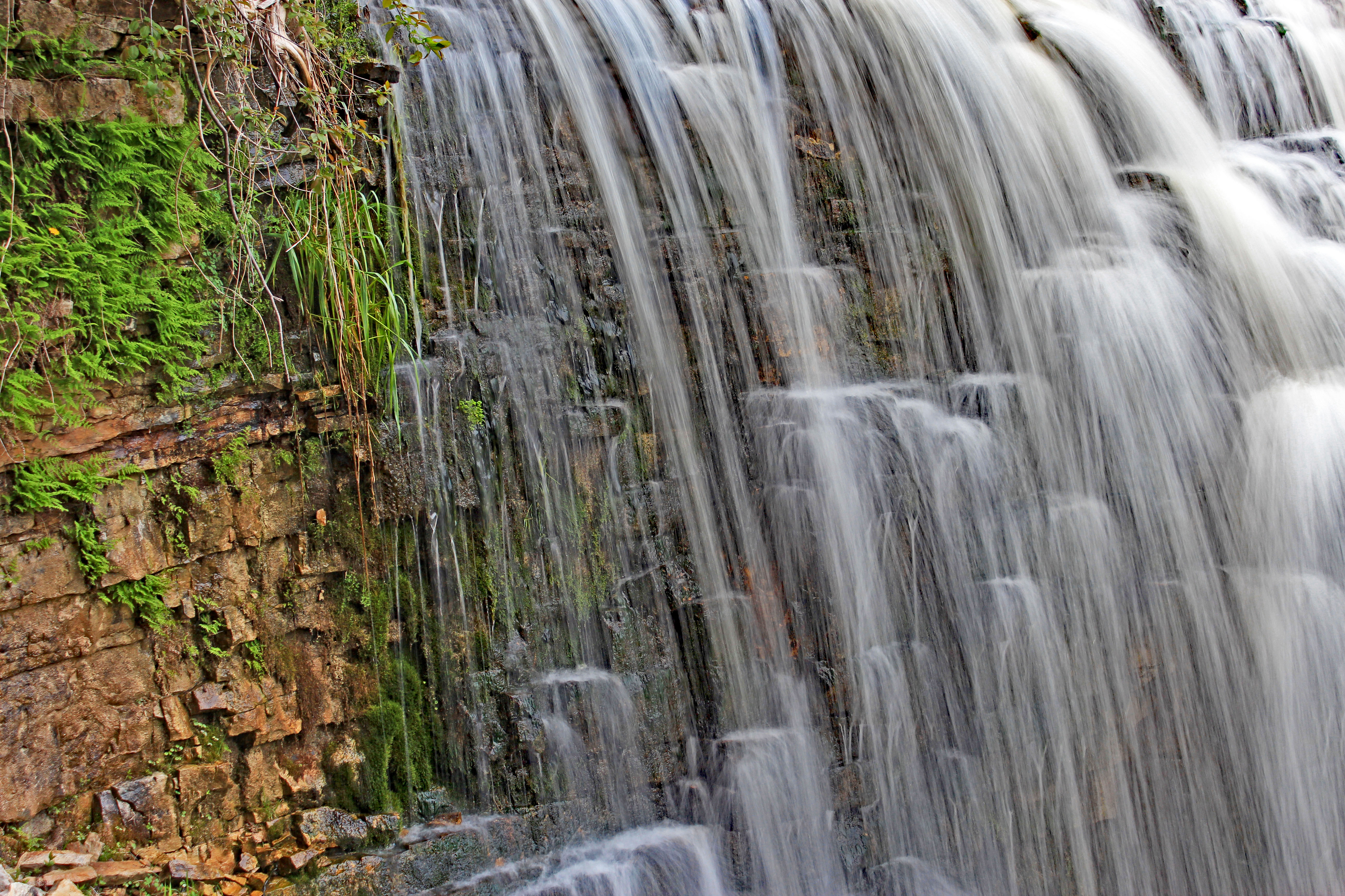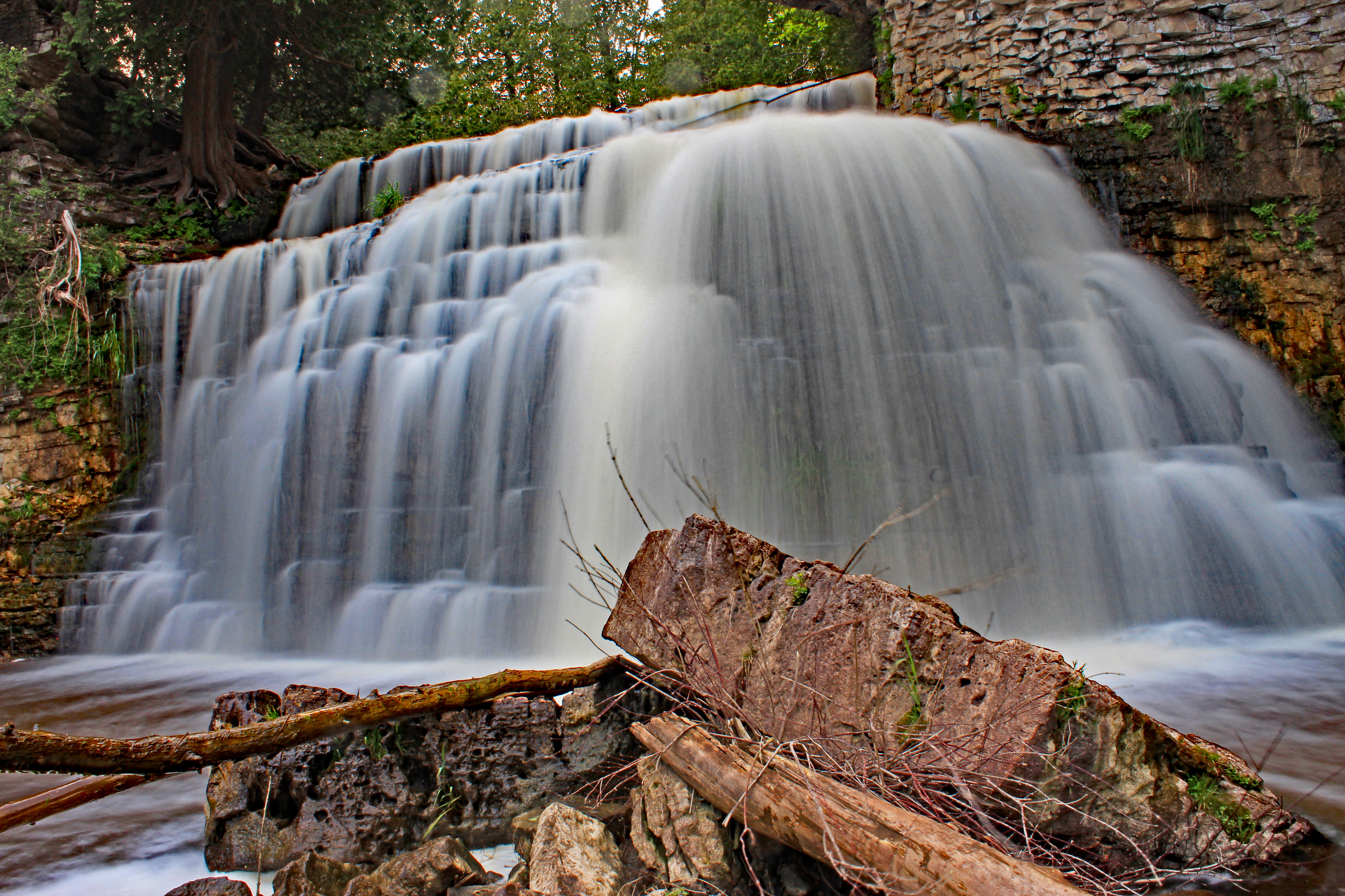 Jones Falls is a waterfall with a height of 35 feet and a varying crest and base, depending on water volume and season. The cascade type waterfall is on the Pottawatomi River within the Pottawatomi Conservation Area. The park is small at 116 hectares, is free to visit and is on the Bruce Trail.