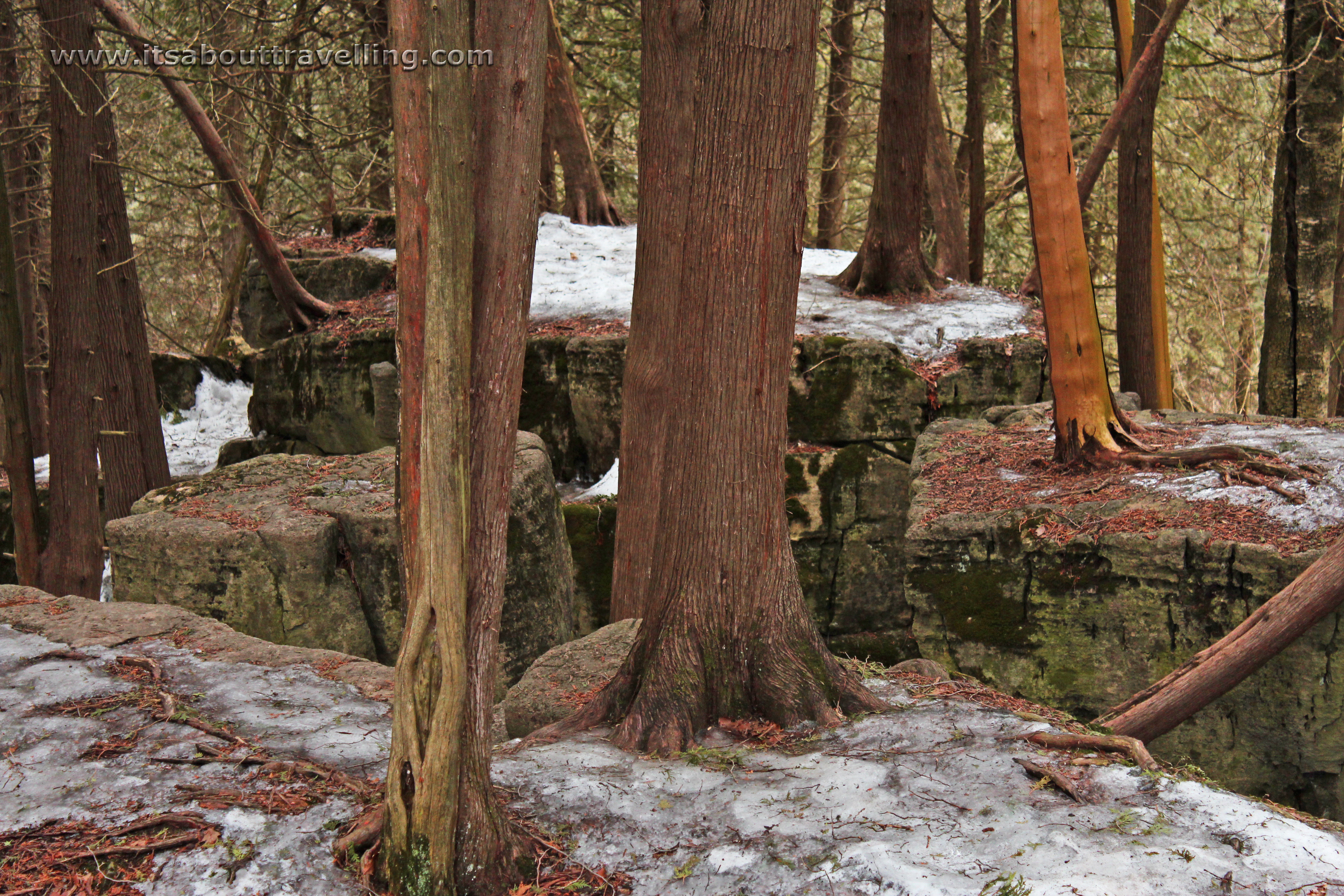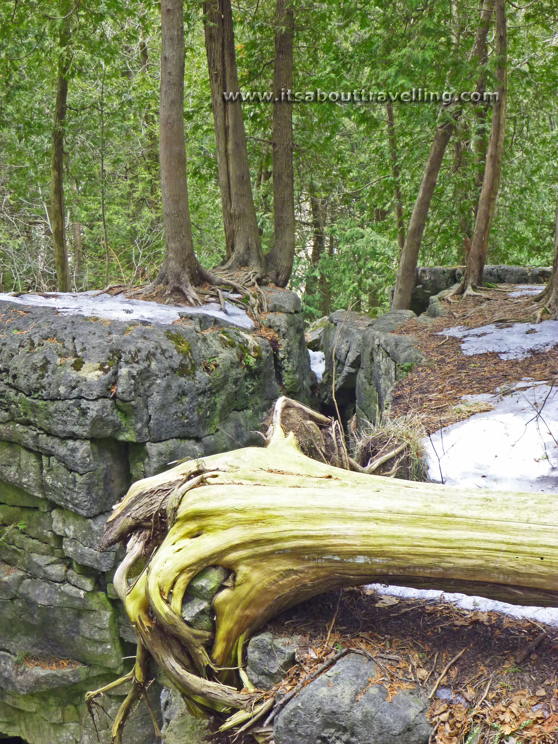 The remaining ice on the smooth rock of the Niagara Escarpment proved to be pretty hazardous, especially when ascending or descending. The potential was always there to slide helplessly into one of the many crevices and fissures in the rock.