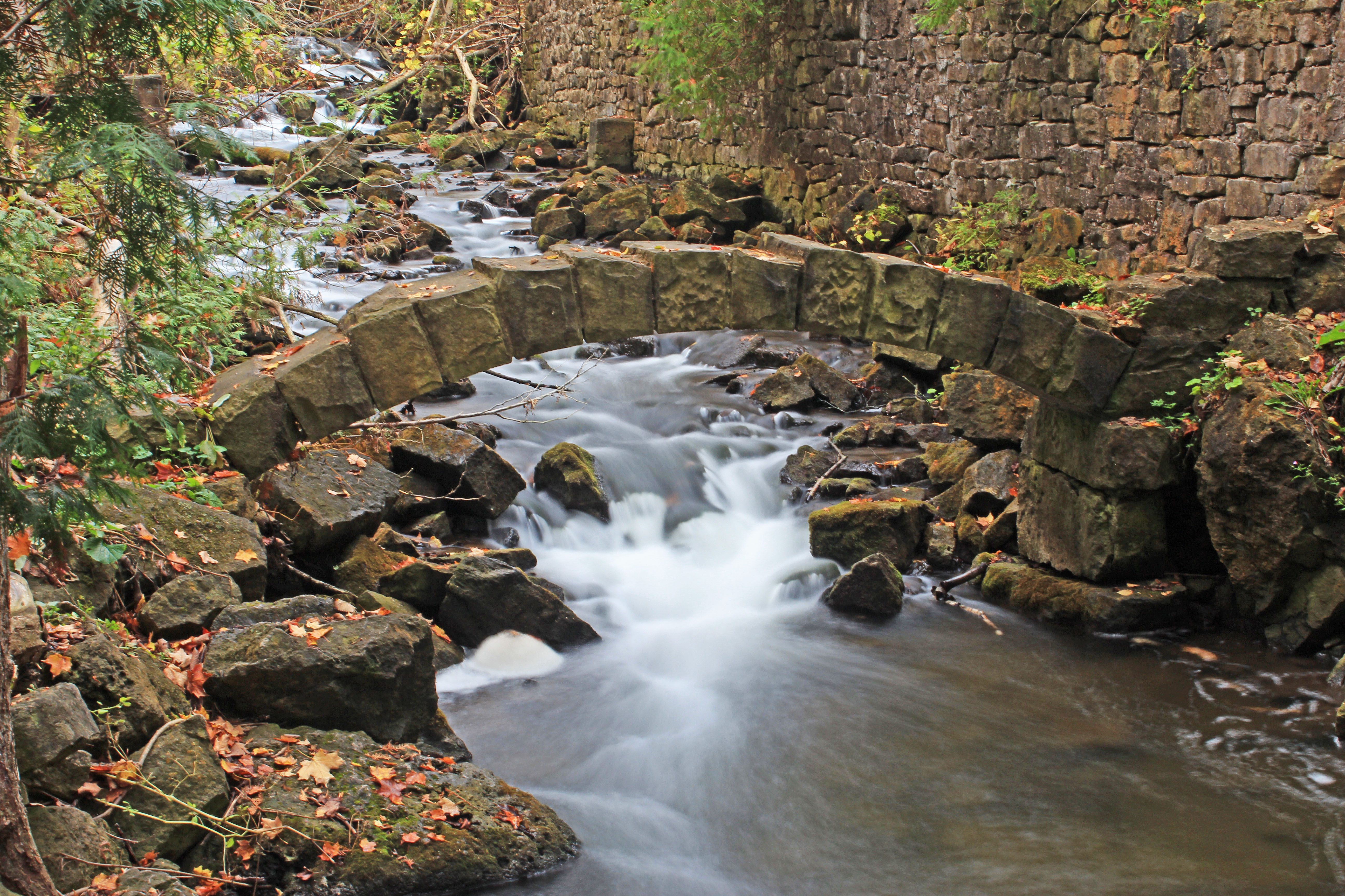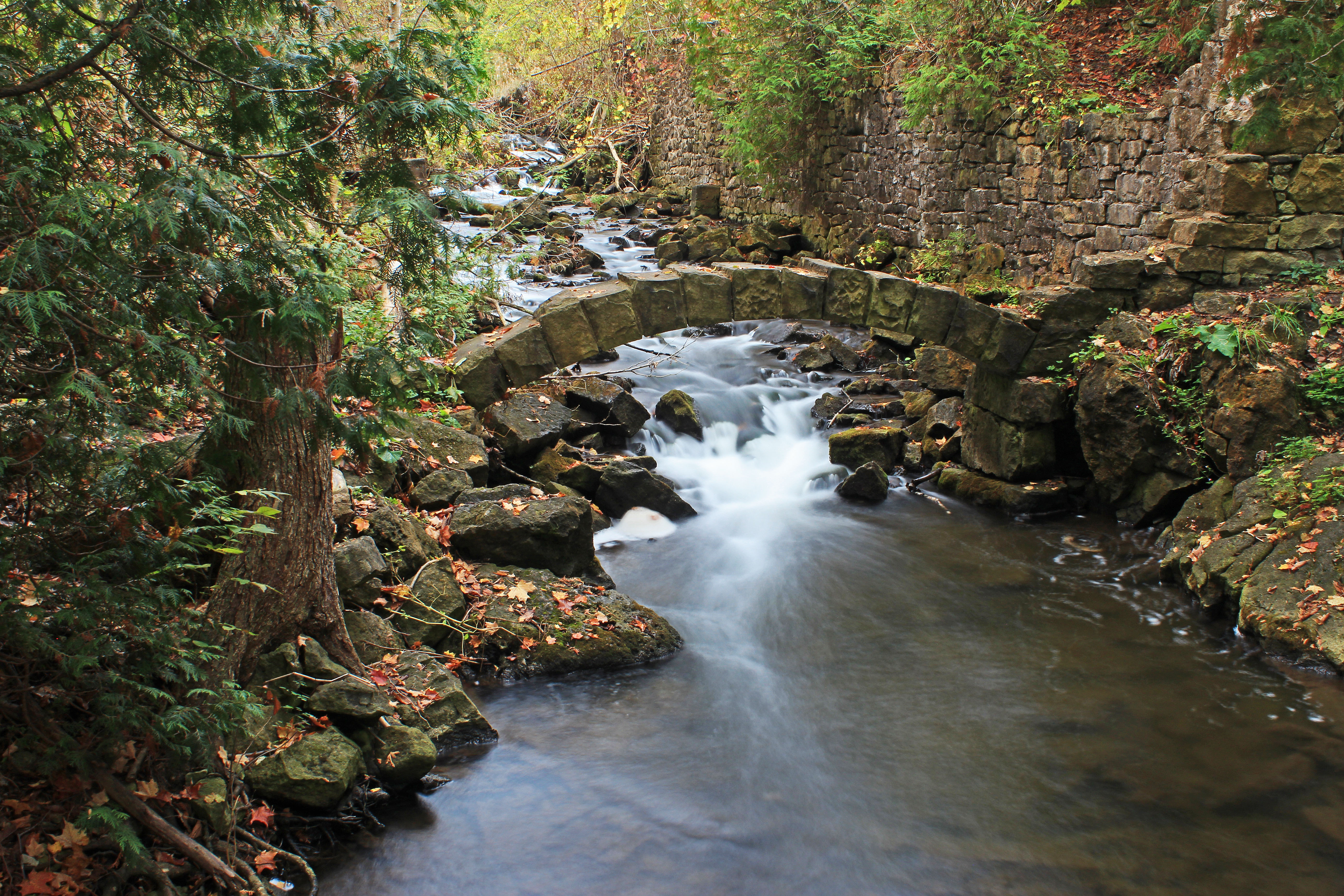 The Bruce Trail runs through the park as the hiking trail makes its way from Niagara-on-the-Lake in the south to Tobermory in the north. The park is known for its 19th century lime kiln ruins, along with its Niagara Escarpment landscape that includes deep crevices and caves. The water passing though the arch in the images above is the Black Creek, part of the Credit River watershed.