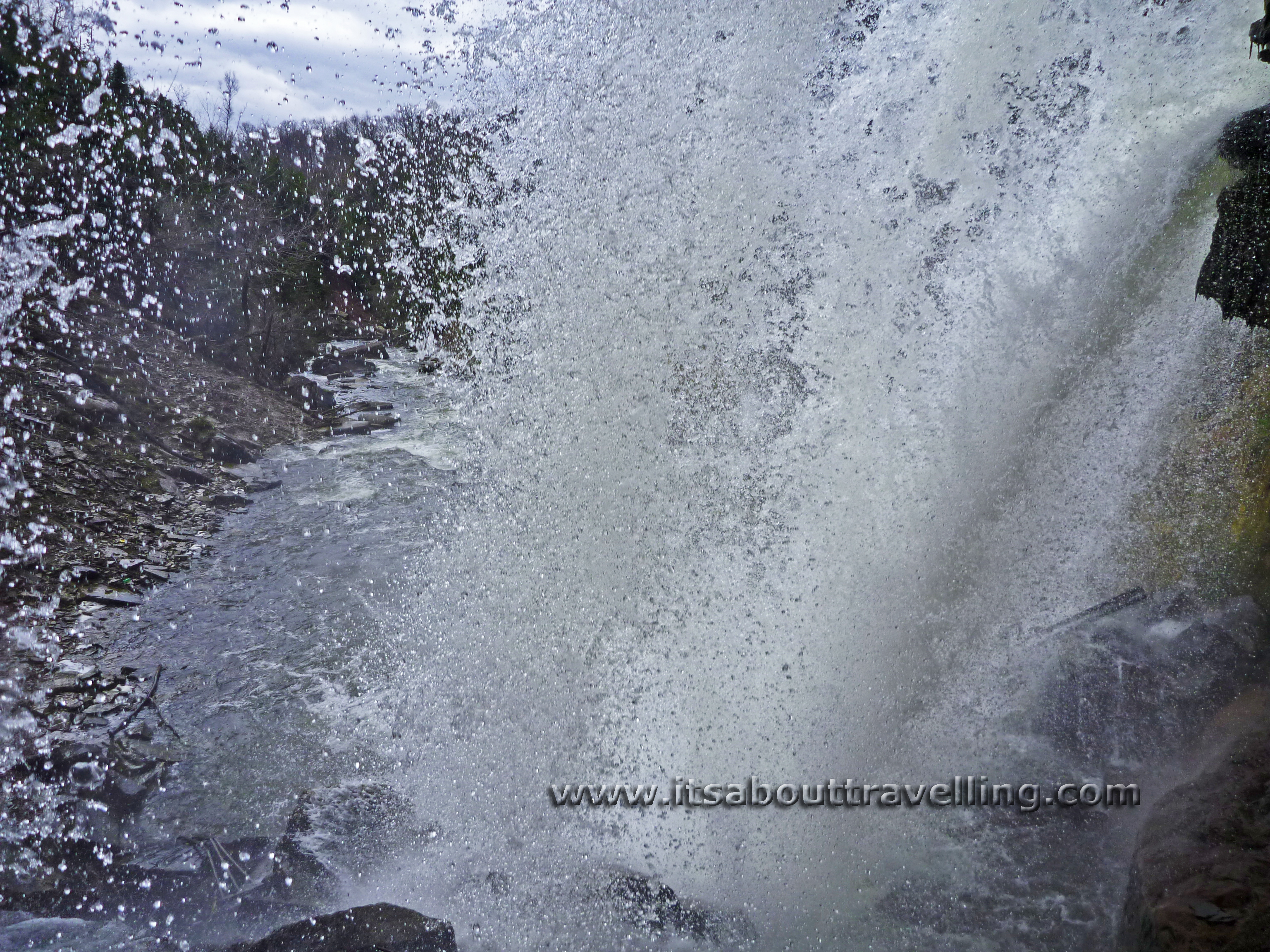 Indian Falls is located just north of Owen Sound, Ontario. The base of the waterfall is easily reached by following the river bed upstream. Looking at the loose rock just below the band of reddish rock near the base of the waterfall, at that point you can walk entirely behind the veil of water.