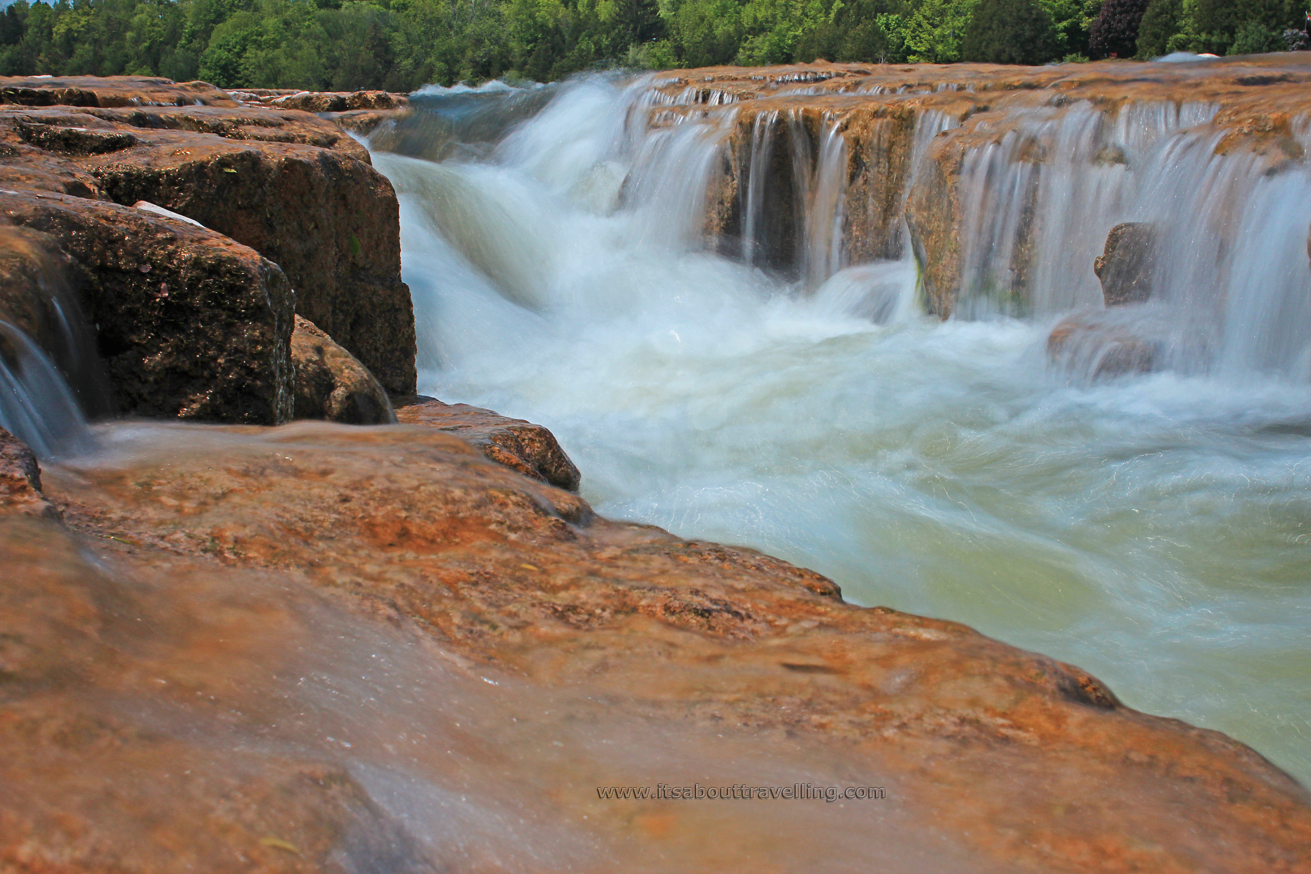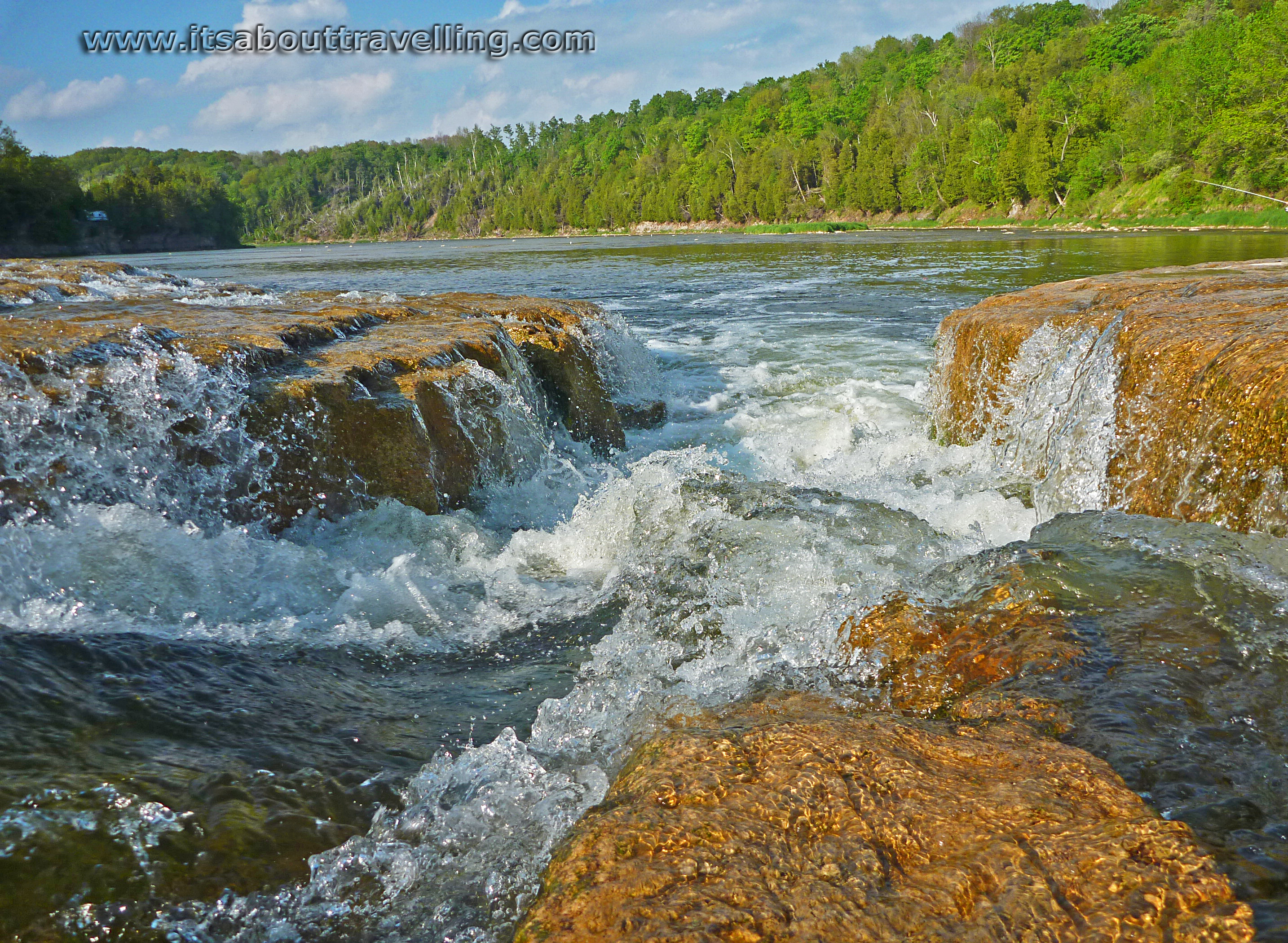 What makes the Maitland Falls unique is not the vertical plunge. This is a short waterfall but it is long. Early in the season, the waterfall covers much of the full width of the wide river. Water flow is quite reduced as the summer goes on. Because the clear water at this point is flowing over flat smooth rock with cuts, or channels, where the main water flow is, it is often no more than knee deep and provides a refreshing walk for visitors.