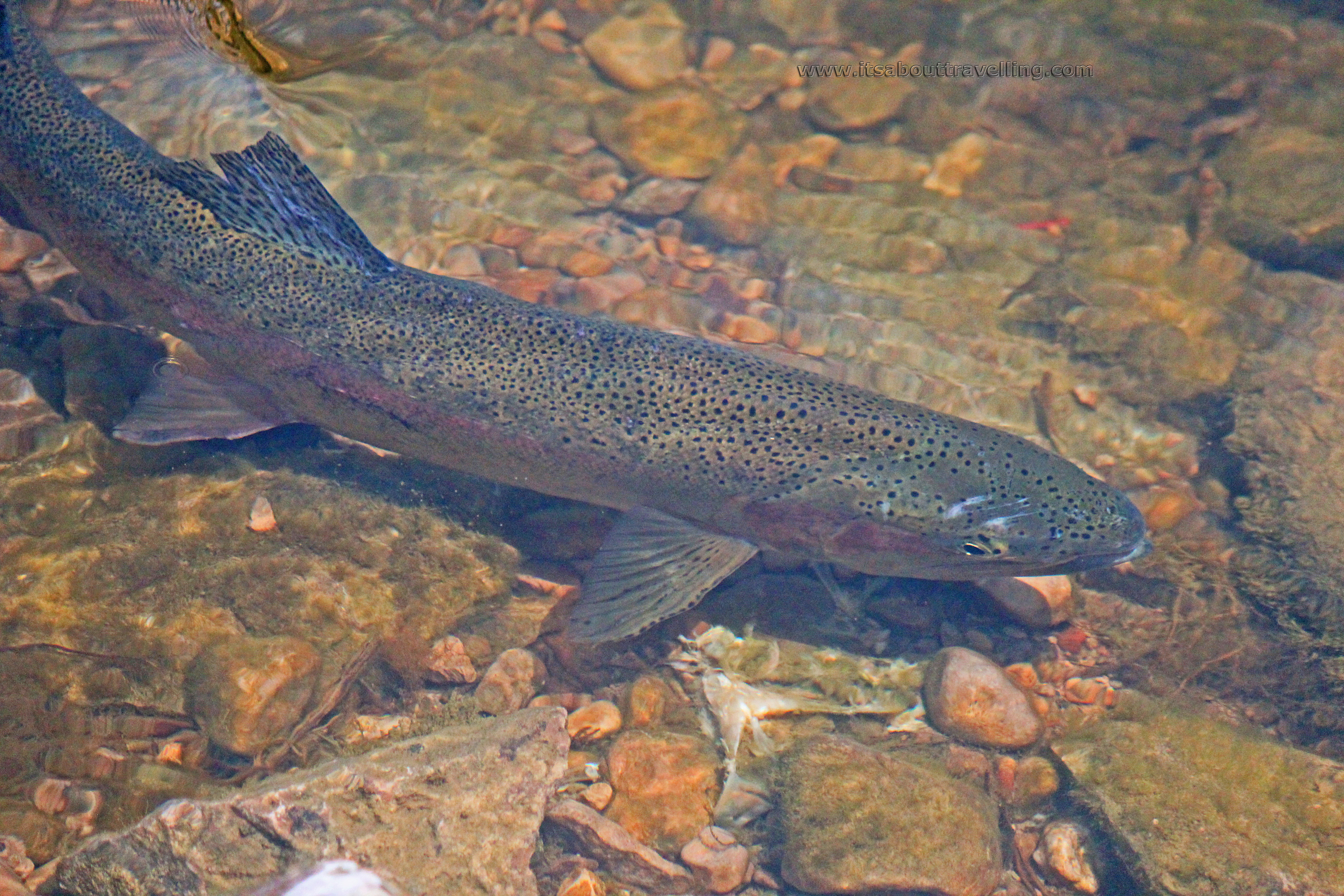 Above is a large Rainbow Trout that had no issues with circling around in shallow water in front of us. Because of the clear water, there were also other large fish visible, mostly the Smallmouth Bass.