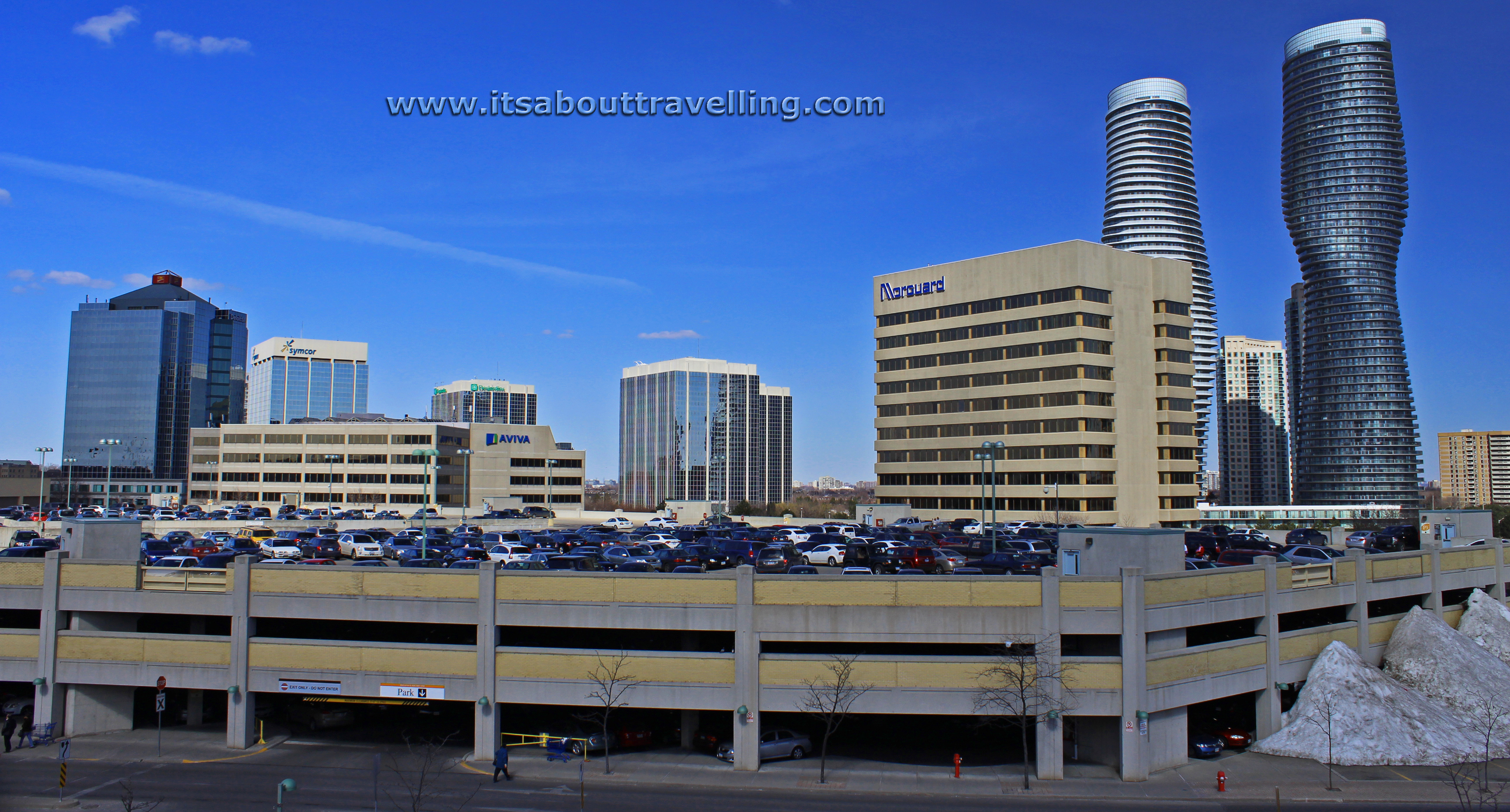 The image above is looking east from one of the parking structures at Square One. To the right are the Absolute World towers or, as they’re nicknamed, the Marilyn Monroe towers.