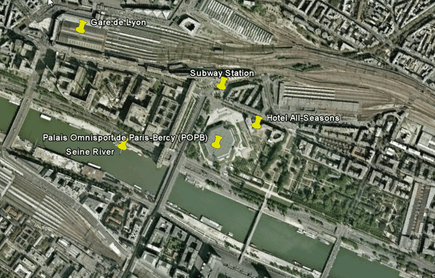 The POPB has a handful of adjacent hotels, making this a great base for a trip to Paris, regardless of whether the Coupe de France is on or not. The best bet for comfort and price is the Hotel All-Seasons (see Google Earth picture). A room at the All-Seasons can be had for around €60 and breakfast is free for all visitors.