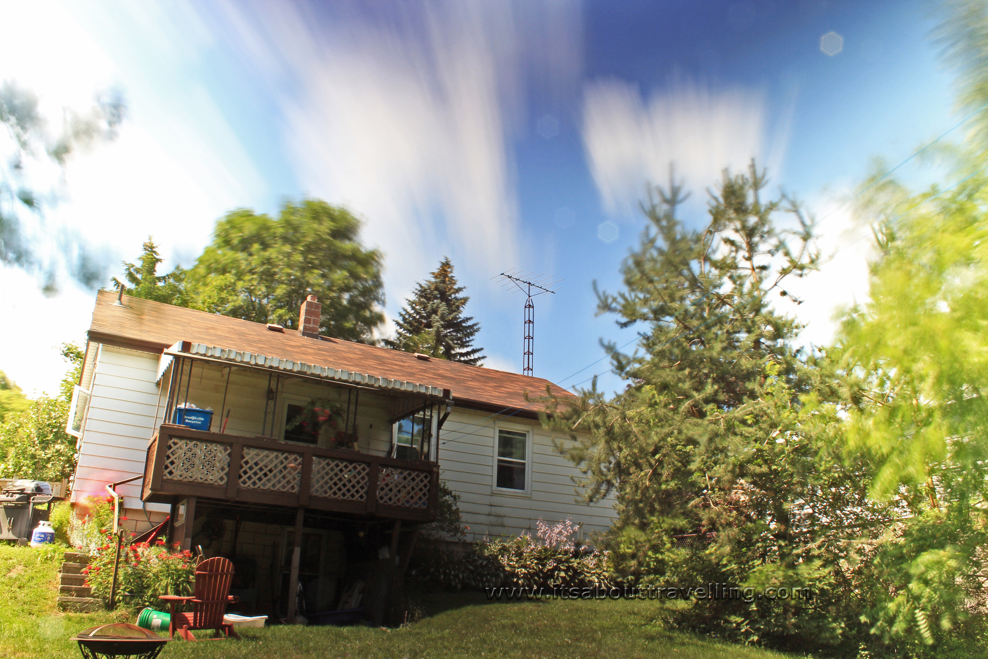 Not the most beautiful subject, this is the back of my home in Orangeville, Ontario, Canada. What the Polaroid Variable Range ND Filter made possible in this and the next image was the blurred clouds. This was a 30 second exposure on an obviously sunny day. If you look to the left side of the house, the reddish blur is my wife.