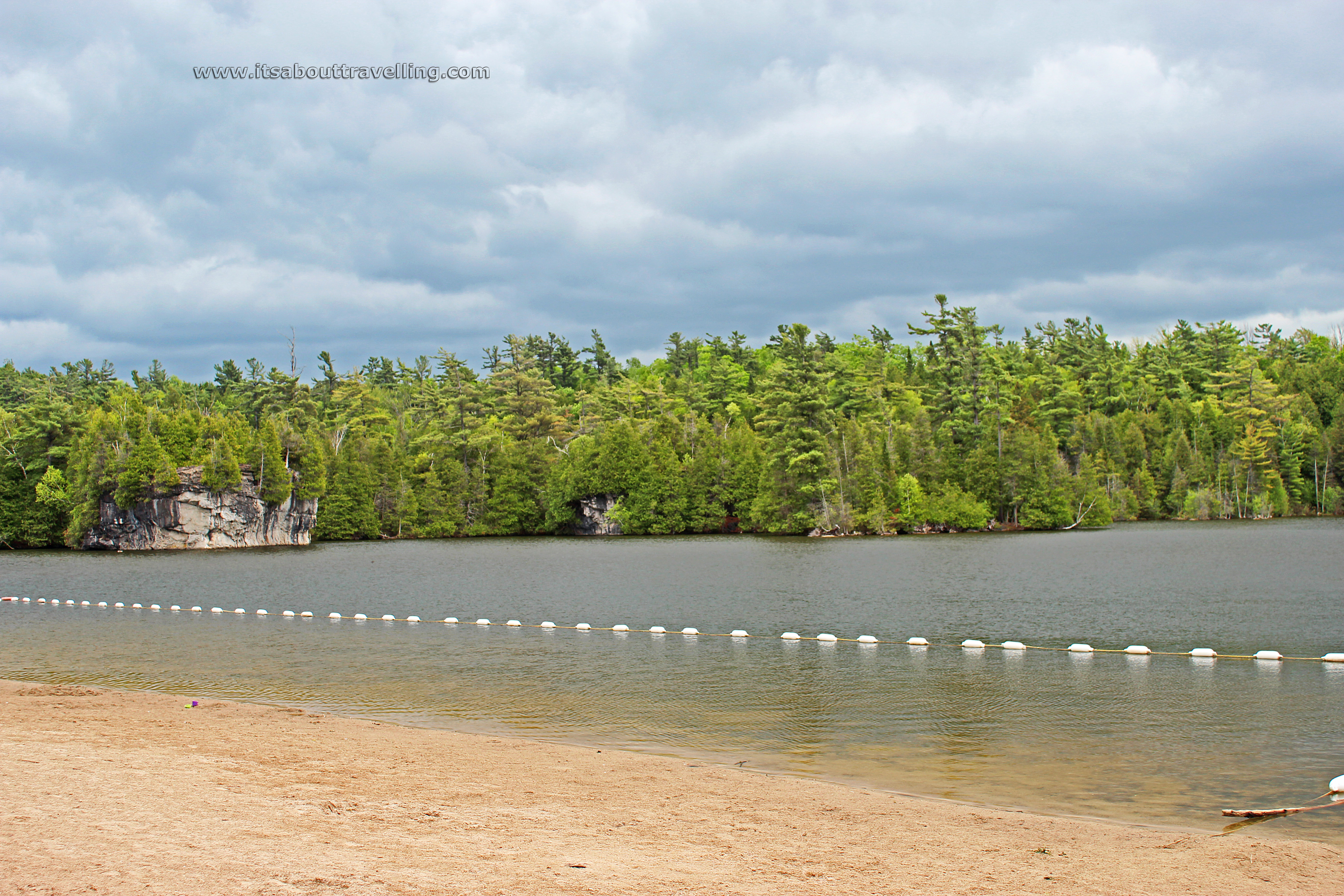 There is a beach to swim at. However, like all lakes in Southern Ontario, its likely bacteria levels will cause the swimming area to be closed often during the warm summer months. If you see the Canada Goose population, you’ll know why.