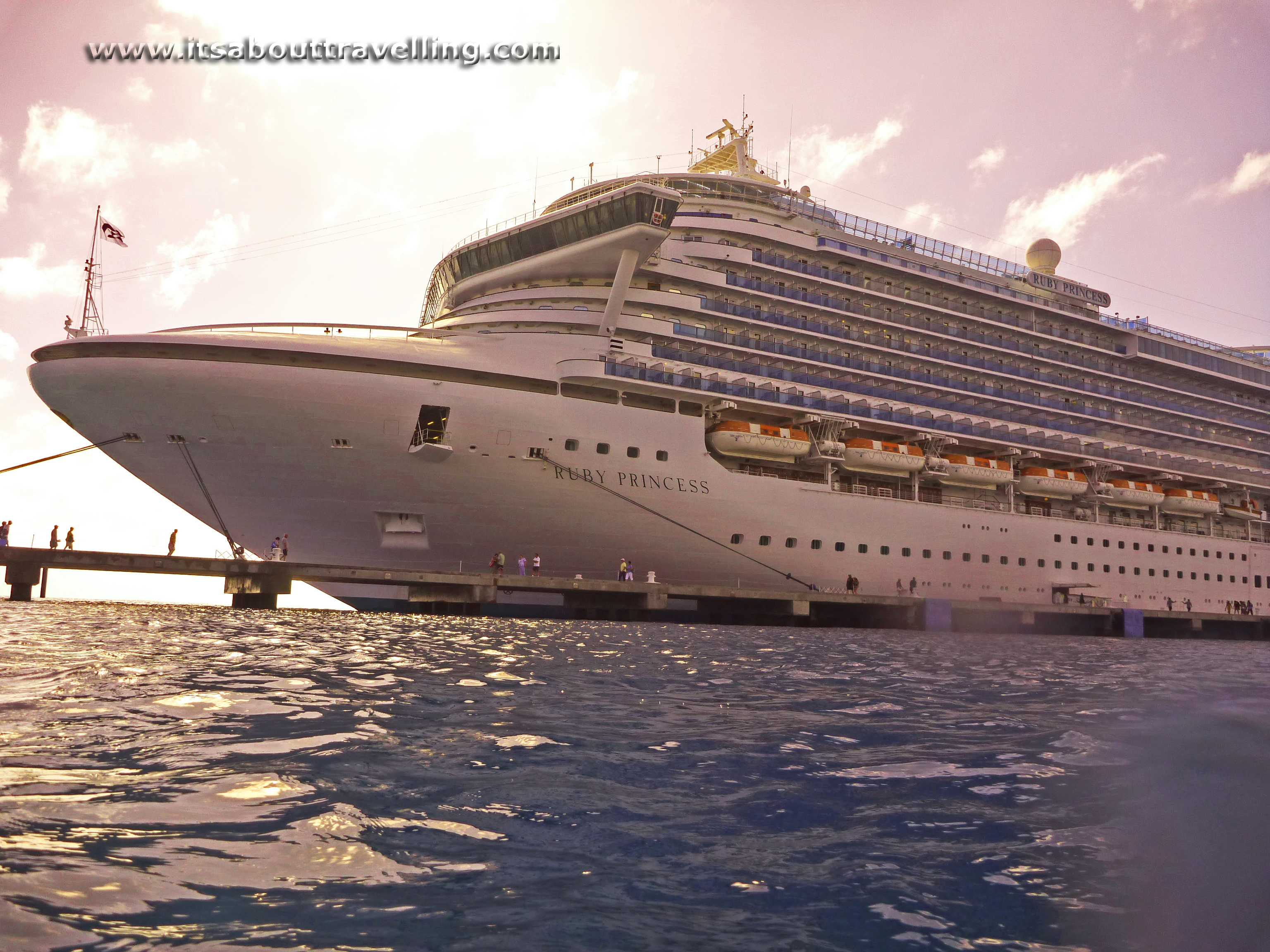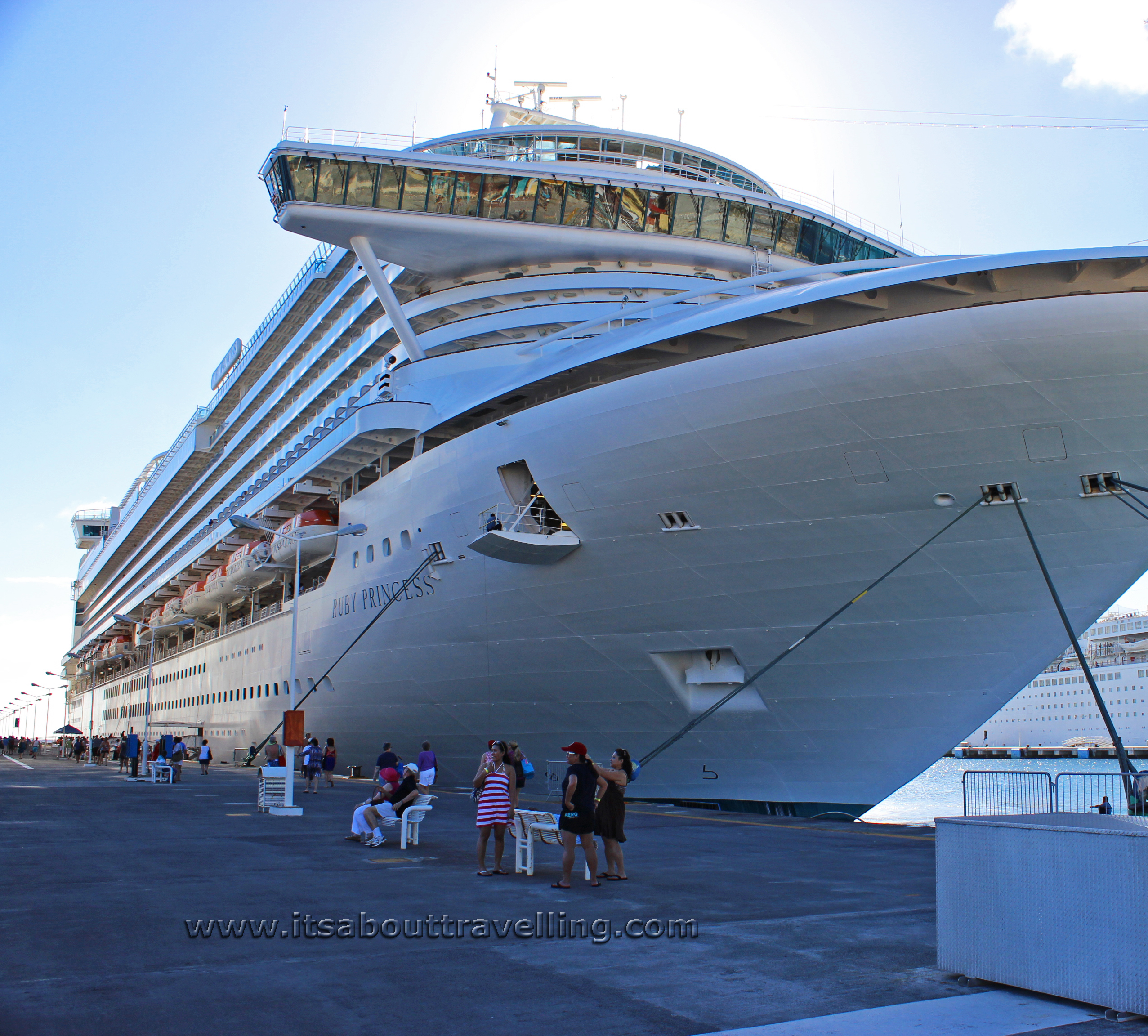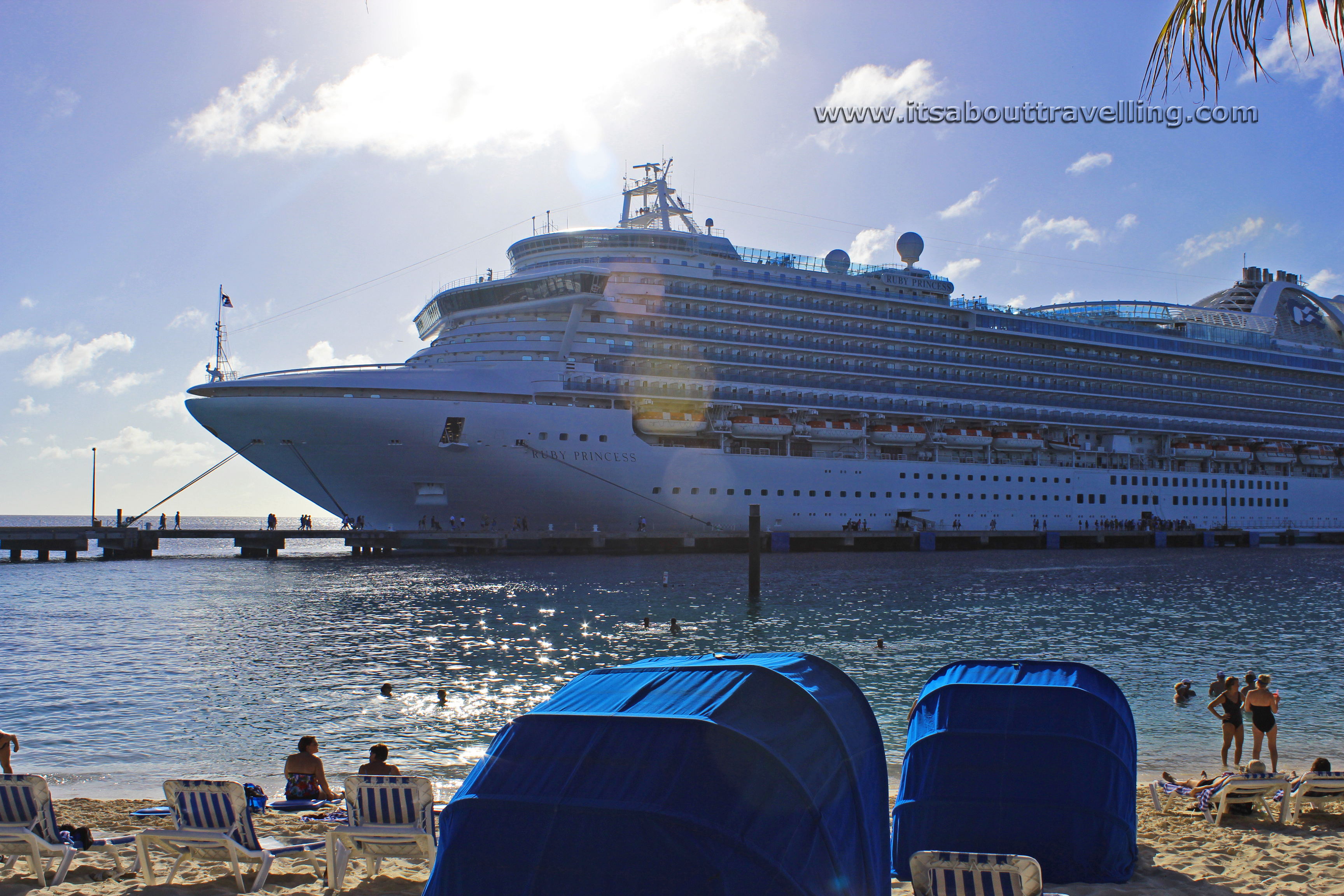In the image above, the Ruby Princess is anchored off Princess Cays, a private beach owned by Princess Cruise Lines on the Island of Eleuthera in the Bahamas. Their is no port at Princess Cays so passengers wishing to go ashore must be shuttled in a tender boat, like the one seen to the left of the ship.