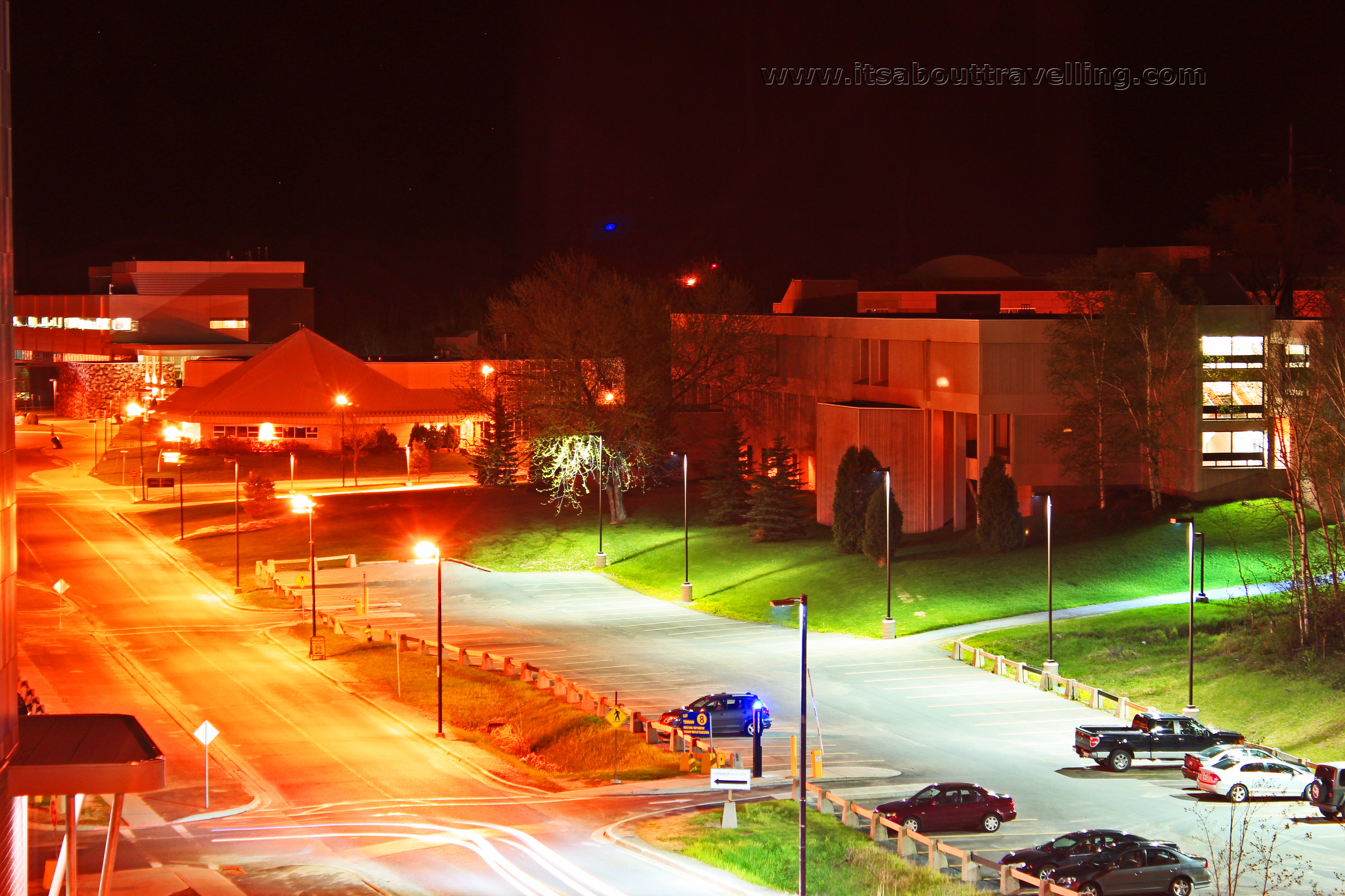 A night exposure of Laurentian University from one of the dorm buildings. Laurentian was founded in 1960 as a bilingual school. Between 9,000 and 10,000 attend the university each year. Laurentian is unique in that it has its own private beach right on campus.