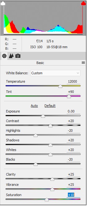 To create this particular image, I shot three RAW images in Aperature Priority mode. Using the exposure compensation function, one image was ‘normal’ while the other two were plus and minus two stops. With the ISO locked at 100, I set the aperature at f/14 (no real reason why..). So, the first image was exposed for 1/5 of a second, the second at 1/20 of a second and the third at 0.8 seconds.