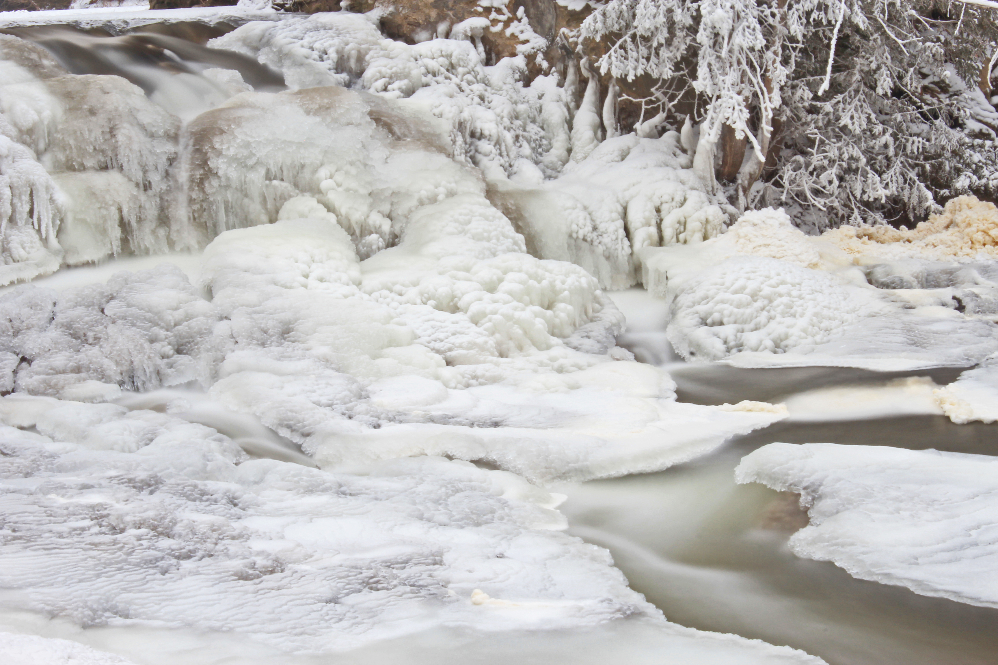 The main waterfall is close down stream from here. In the summer, you can get to the base of that waterfall, but even then the journey can be quite daunting. Once the temps fall below freezing, it becomes nearly impossible without ice picks. In the same manner as Niagara Falls, there is a constant cloud of drizzle in the air, splashed up from the impact of the cascade. In winter, this results in a constant freezing rain which coats everything with ice.